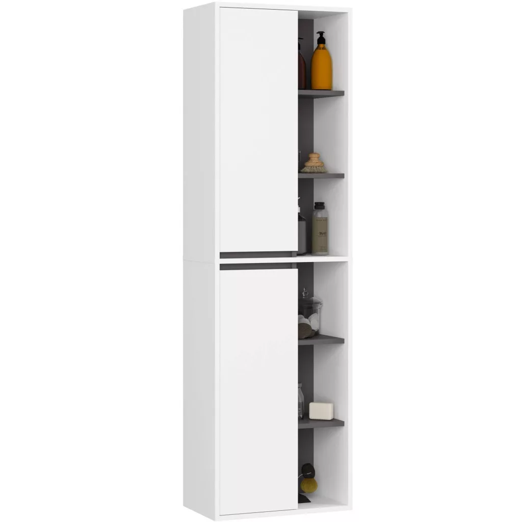 Modern, magas fürdőszobai szekrény 10 praktikus polccal és két ajtóval, amely maximális tárolóhelyet biztosít fürdőszobai kellékek számára.