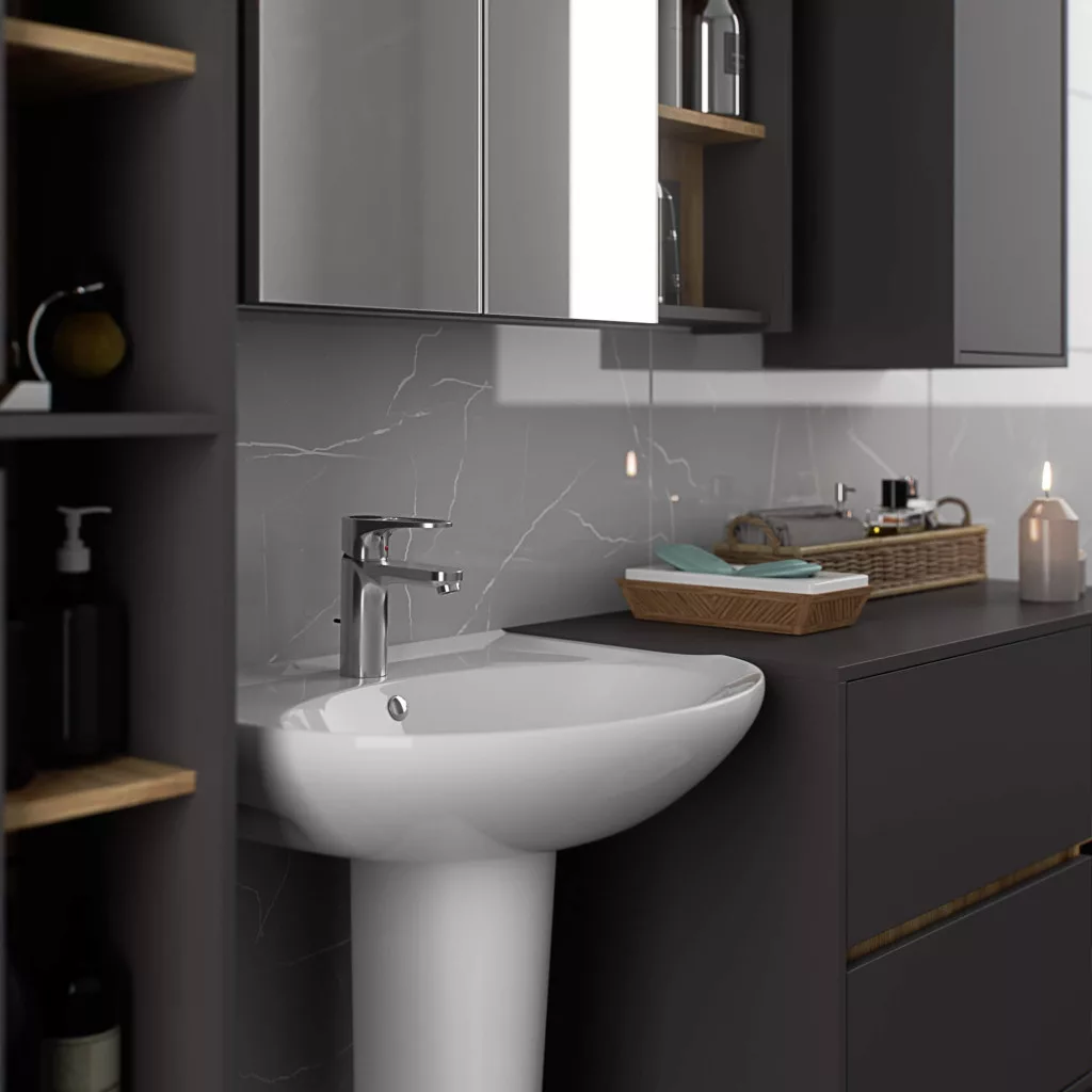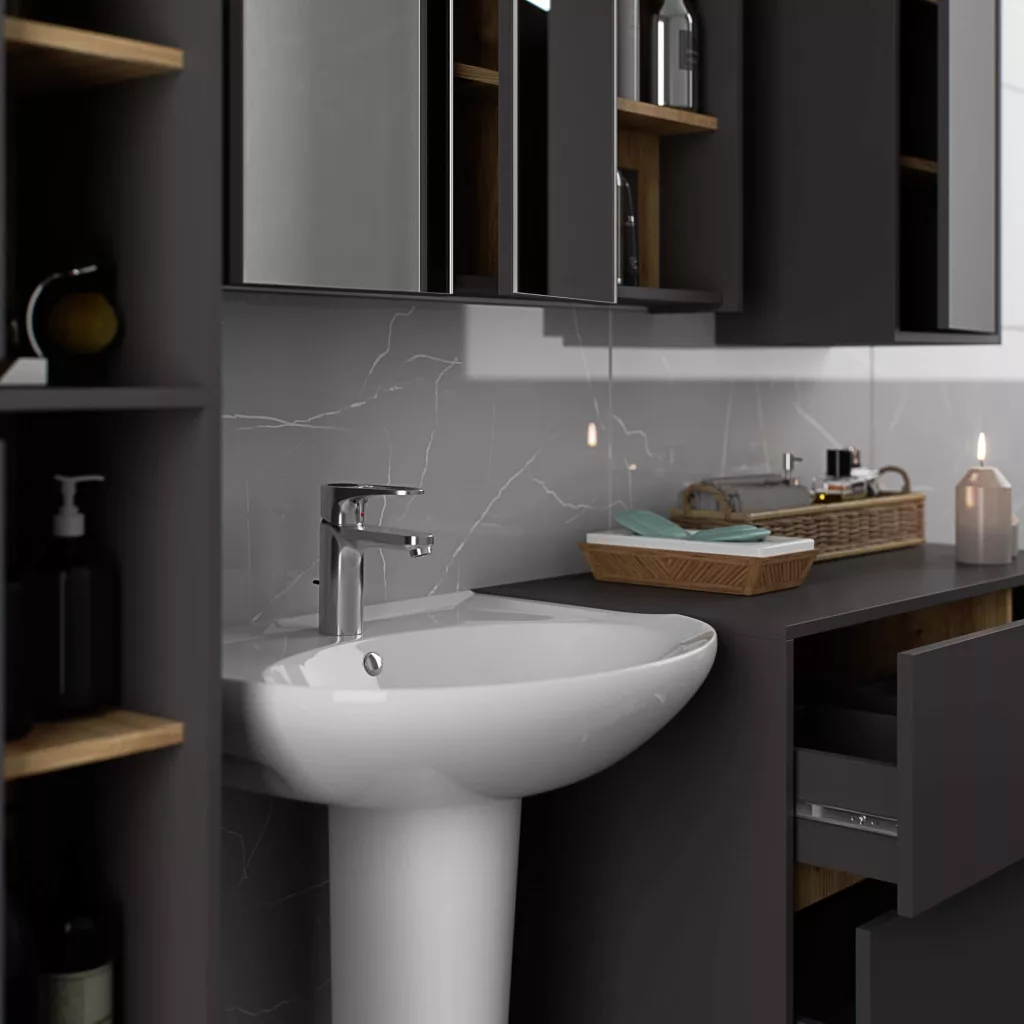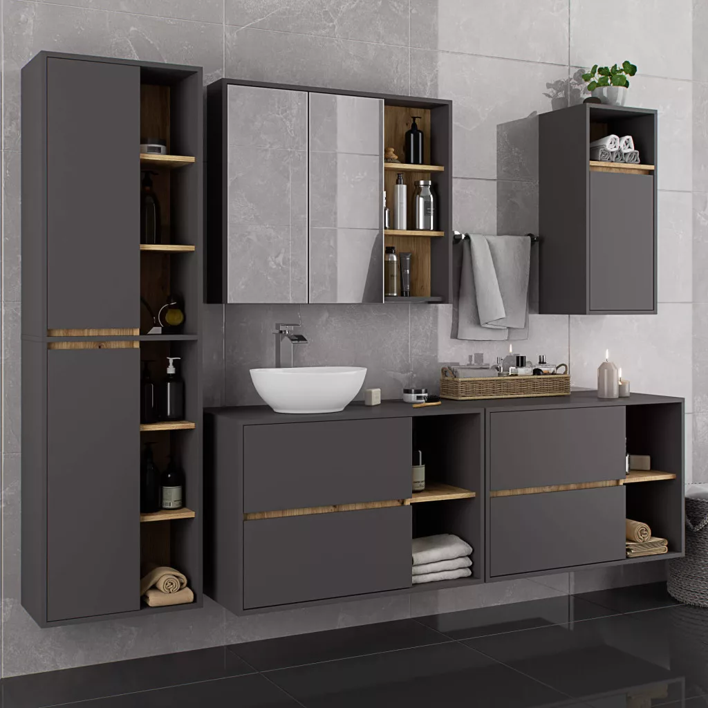 A VAMI W50 fali fürdőszobai szekrény ötvözi a praktikus tárolást az elegáns megjelenéssel. A grafit szürke korpusz és artisan tölgy részletek modern kontrasztot alkotnak, míg a két ajtós kialakítás és a nyitott polcrendszer rugalmas tárolási lehetőséget biztosít. A 170 cm magas szekrény optimálisan kihasználja a függőleges teret.