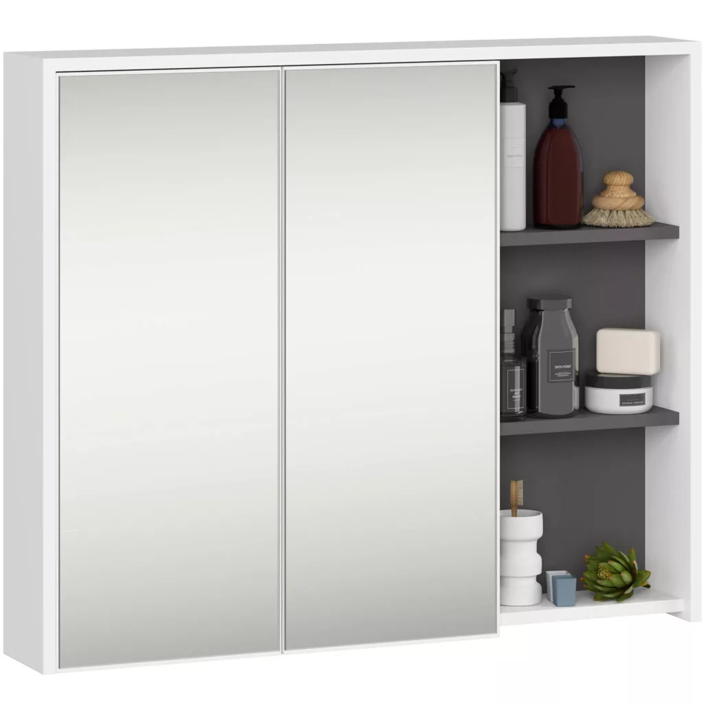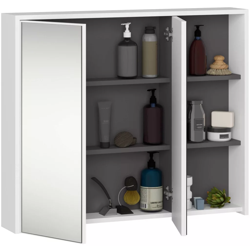 Modern, tükrös fürdőszobai fali szekrény 6 tárolóhellyel, amely tökéletes megoldást nyújt a mindennapi szépségápolási rutinhoz és fürdőszobai kellékek tárolásához.