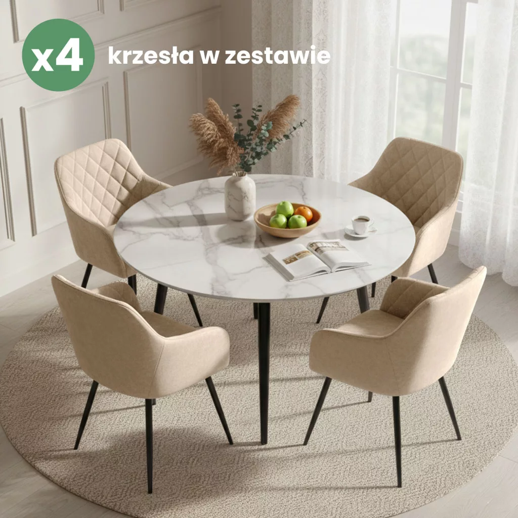 Elegáns bézs welur kárpitozású székek fekete fém lábakkal, 4 darabos készletben. A rombusz mintázatú steppelt felület és a puha tapéta kiváló kényelmet és stílusos megjelenést biztosít modern és klasszikus enteriőrökben egyaránt.