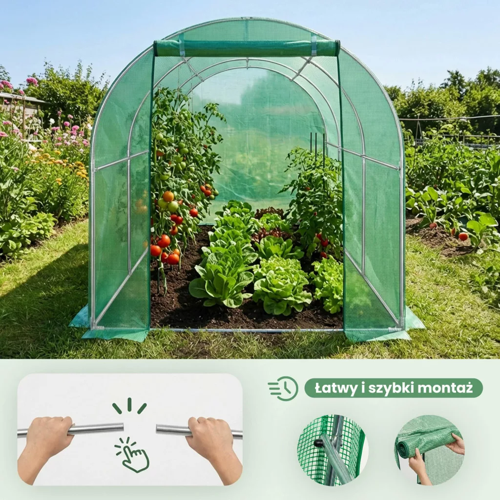 A galvanizált acélváz biztosítja a szerkezet stabilitását és tartósságát, míg a 6 ablak és az 1 felgöngyölhető ajtó lehetővé teszi a légáramlás kényelmes szabályozását. A háromszekciós kialakítás egyszerű összeszerelést tesz lehetővé, a talajba rögzíthető horgonyokkal pedig biztonságosan rögzíthető. Tökéletes választás azok számára, akik egészséges, saját termesztésű növényeket szeretnének élvezni közvetlenül a kertjükből.