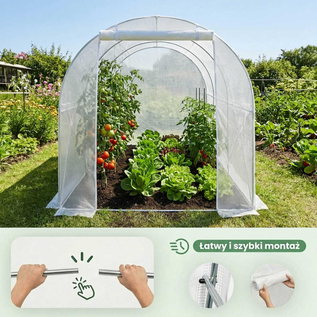 A fehér színű, ocynkozott acélvázas szerkezet rendkívül stabil és tartós. A 6 ablak és a felgöngyölhető ajtó lehetővé teszi a szellőzés pontos szabályozását, így mindig optimális mikroklímát teremthet növényei számára. A 3 szekciós, tuneltípusú üvegház egyszerűen összeszerelhető és talajba rögzíthető, így hosszú távon megbízható védelmet nyújt kertje számára.