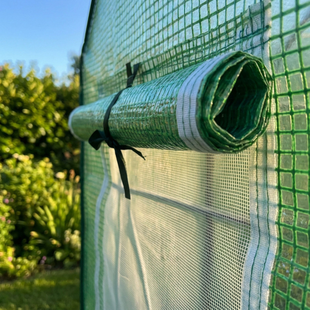 A roló típusú bejárati ajtó és a két oldalsó ablak kiváló szellőzést biztosít, így könnyedén szabályozhatja a belső hőmérsékletet és páratartalmat. A 2 méteres belmagasság kényelmes munkavégzést tesz lehetővé, akár magasabb növények termesztése esetén is. A por bevonatú acél váz és a hálóval erősített fólia tartós konstrukciót eredményez, amely éveken át szolgálja kertészeti céljait. Egyszerű összeszerelés, talajba rögzíthető horgonyokkal.