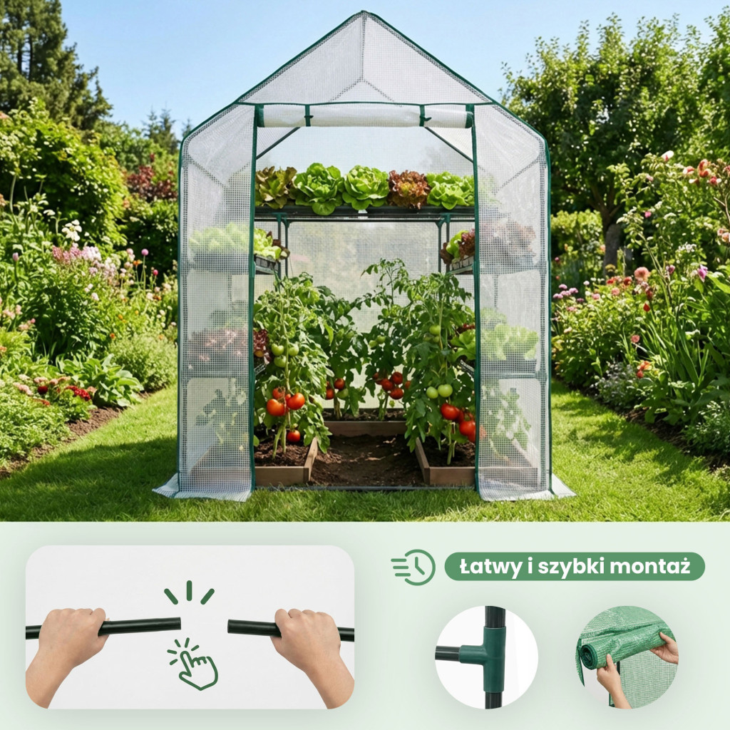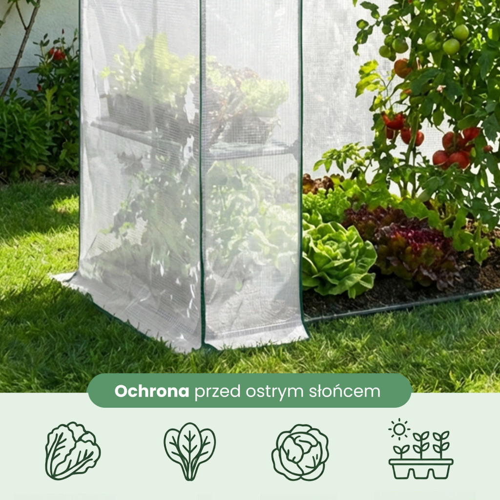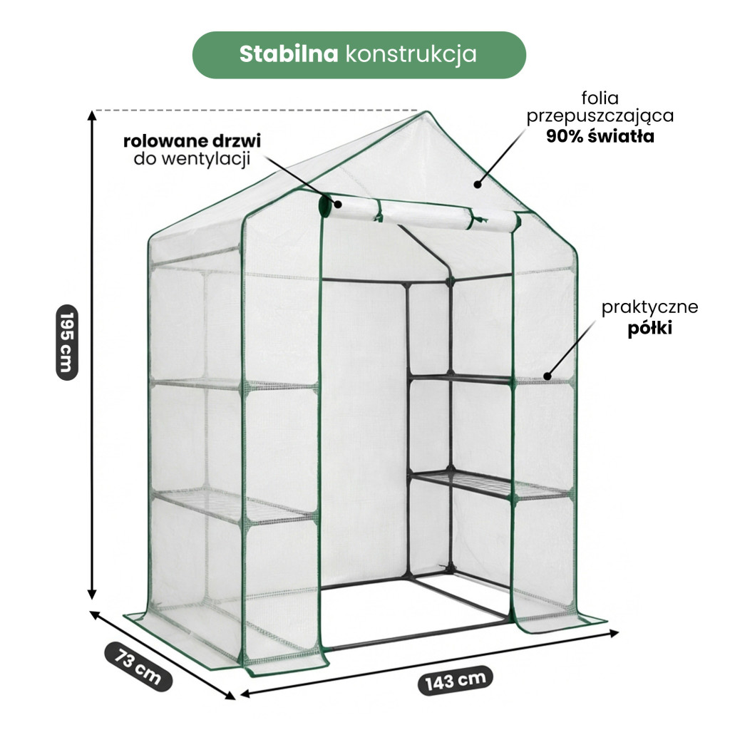 A stabil, porbevonattal kezelt acél váz 16 mm átmérőjű csövekből készült, amely hosszú élettartamot és megbízható szerkezetet garantál. A praktikus, felgöngyölhető ajtó könnyű hozzáférést biztosít a növényekhez, a talajba rögzíthető horgonyokkal pedig biztonságosan rögzíthető. A háromszintes polcrendszer lehetővé teszi a tér hatékony kihasználását, így palántákat, fűszernövényeket, zöldségeket és dísznövényeket egyaránt termeszthet egész évben.