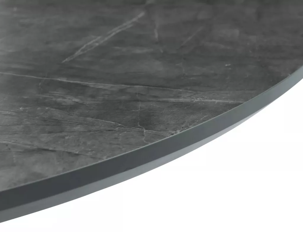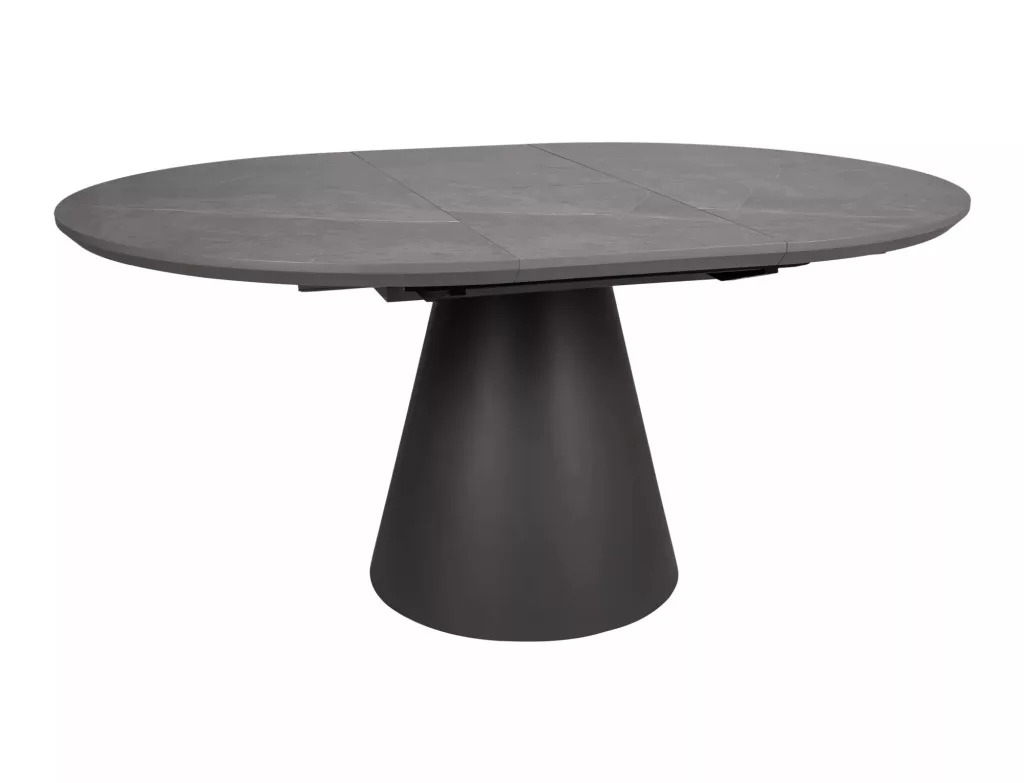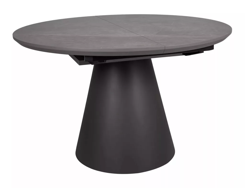 Modern, kihúzható kerek étkezőasztal márvány hatású szürke asztallappal és matt fekete lábazattal, amely tökéletes választás kisebb és nagyobb étkezőterekbe egyaránt.