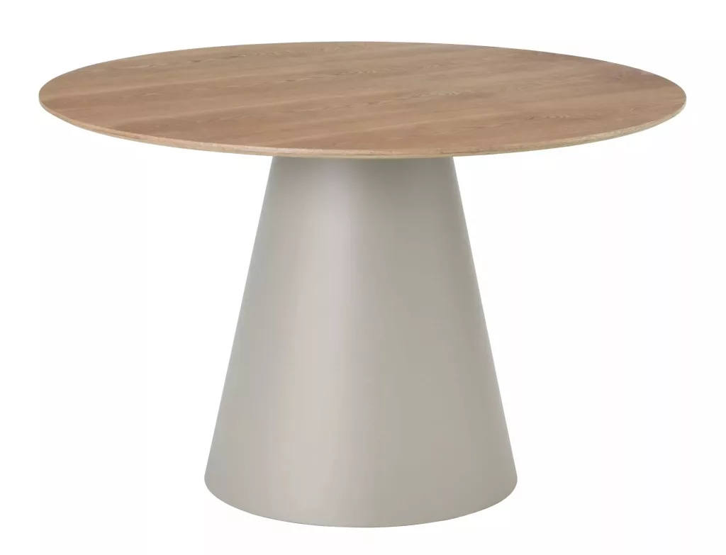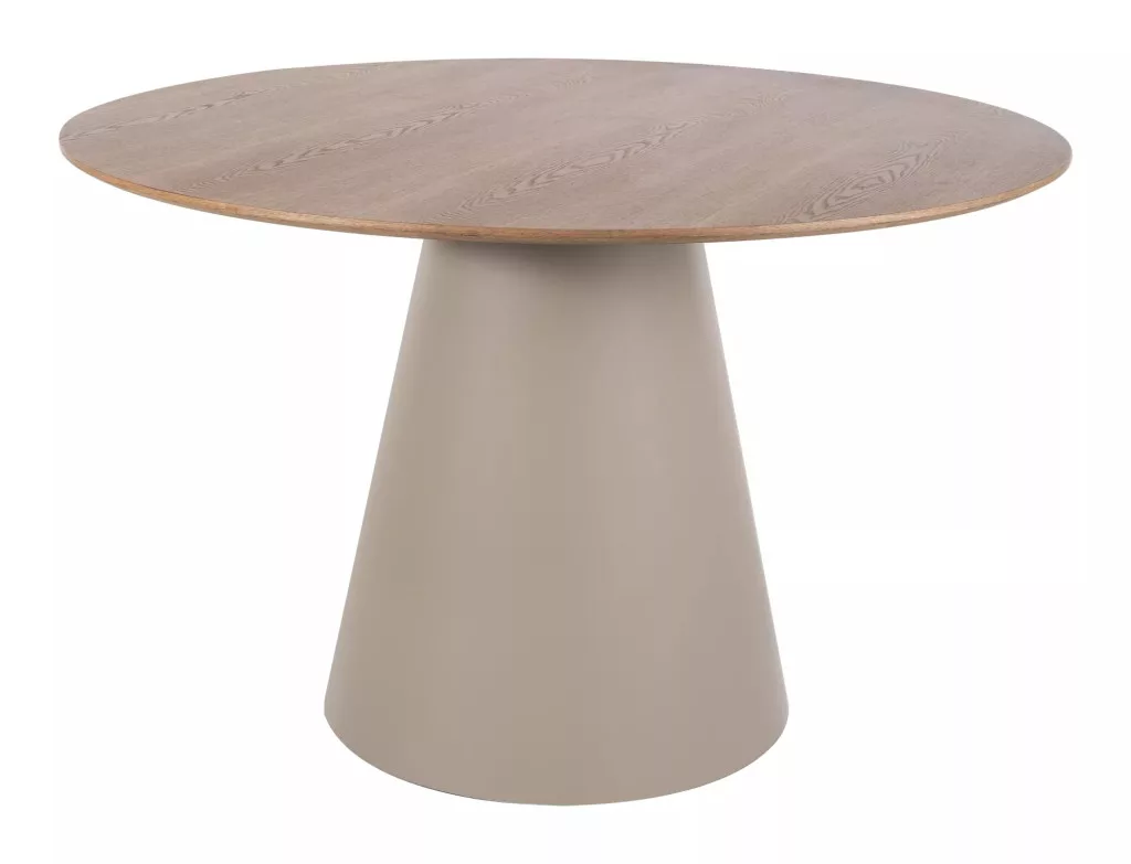 Modern, kör alakú étkezőasztal természetes tölgy asztallappal és elegáns kasmír színű lábazattal, amely tökéletes választás a kortárs étkezőterekbe.