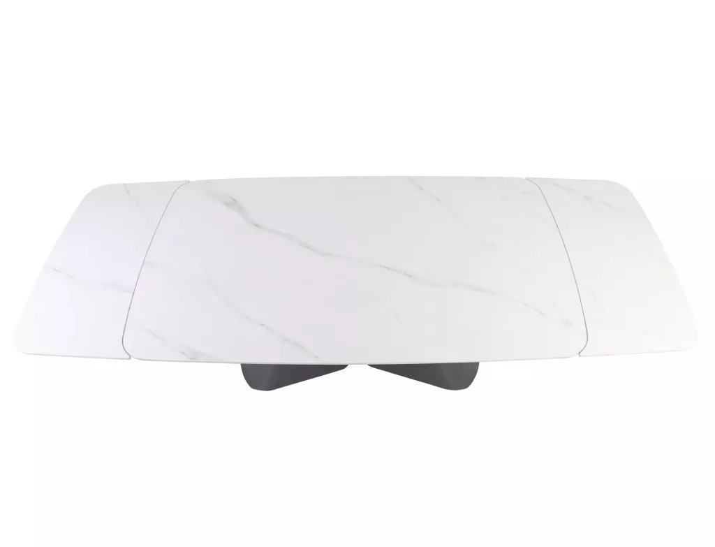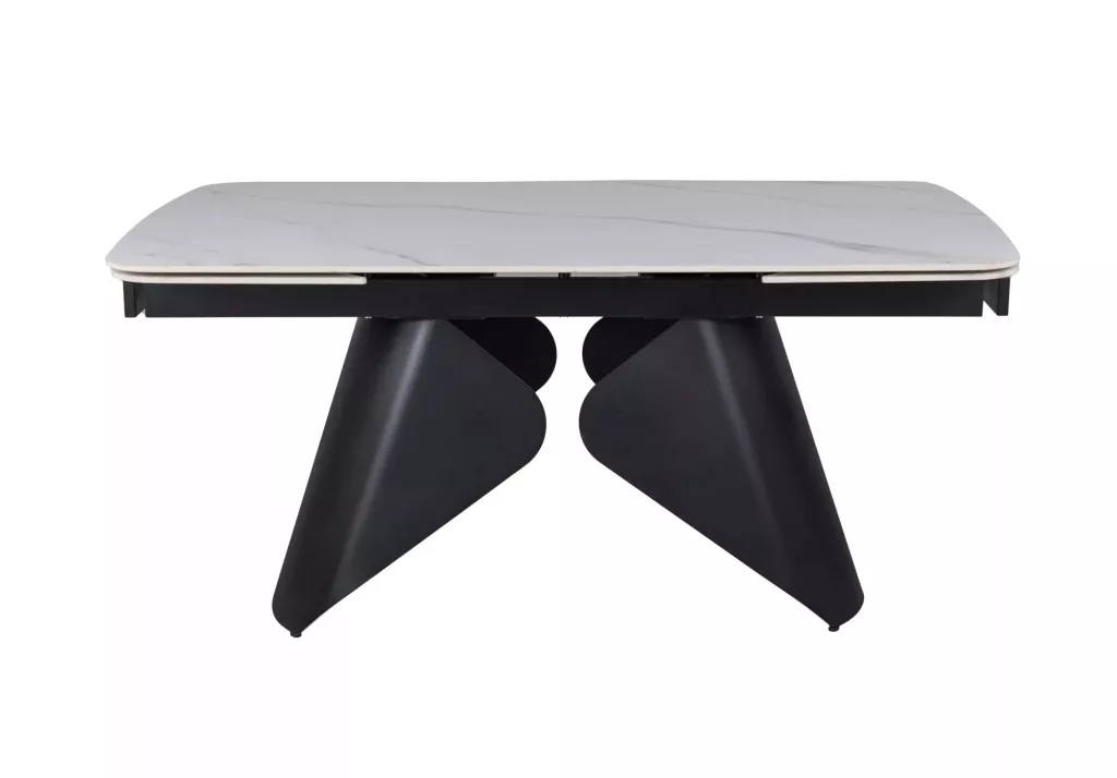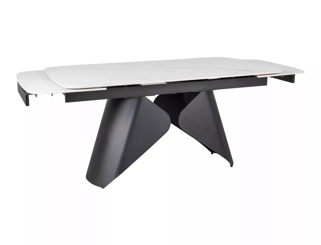 Modern, kihúzható étkezőasztal kerámia asztallappal és egyedi geometrikus fém vázzal, amely tökéletes választás a kortárs étkezőterekbe.