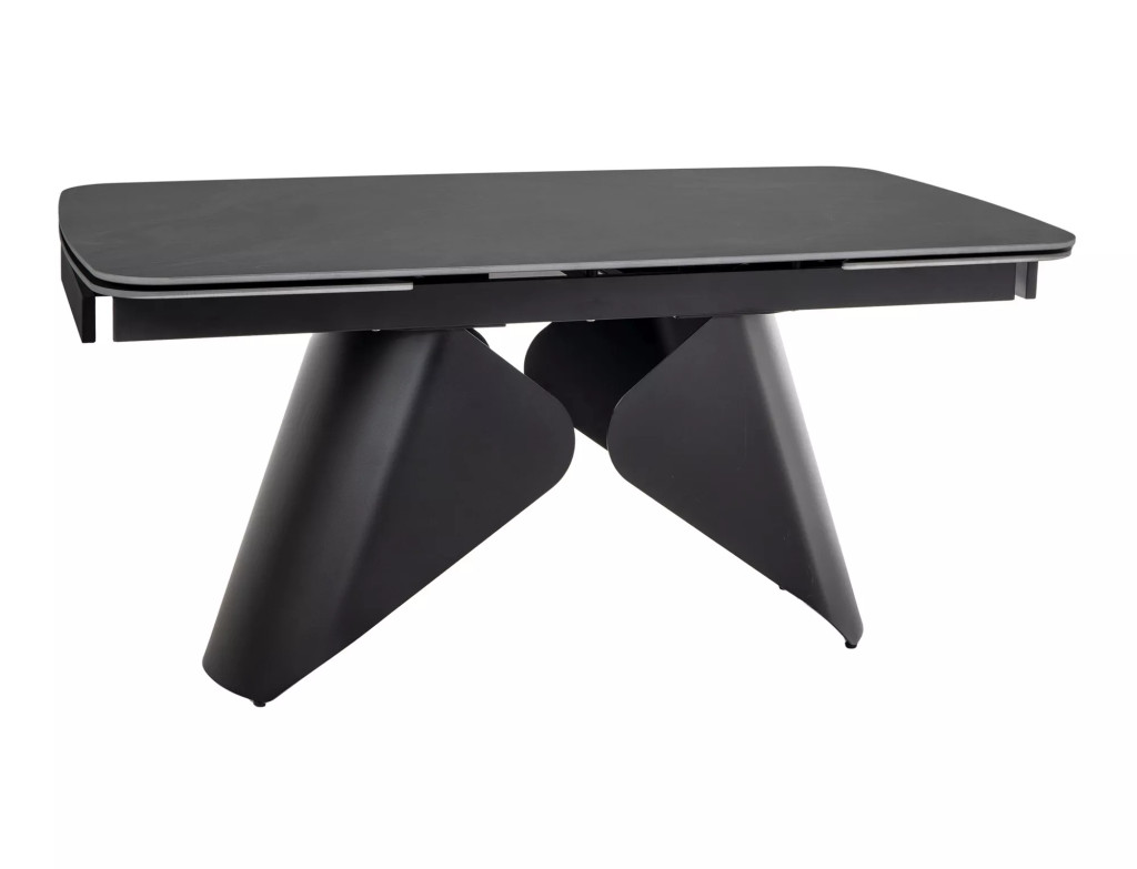 Modern, kihúzható étkezőasztal kerámia asztallappal és egyedi geometrikus fém lábszerkezettel, matt fekete kivitelben.