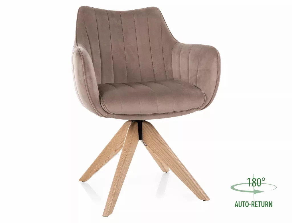 A szék különlegessége a 180 fokos forgási képesség és az auto-return funkció, amely automatikusan visszafordítja az ülést eredeti pozíciójába. A karfás kialakítás extra kényelmet biztosít, míg a stabil, csillag alakú fa láb modern megjelenést kölcsönöz.
