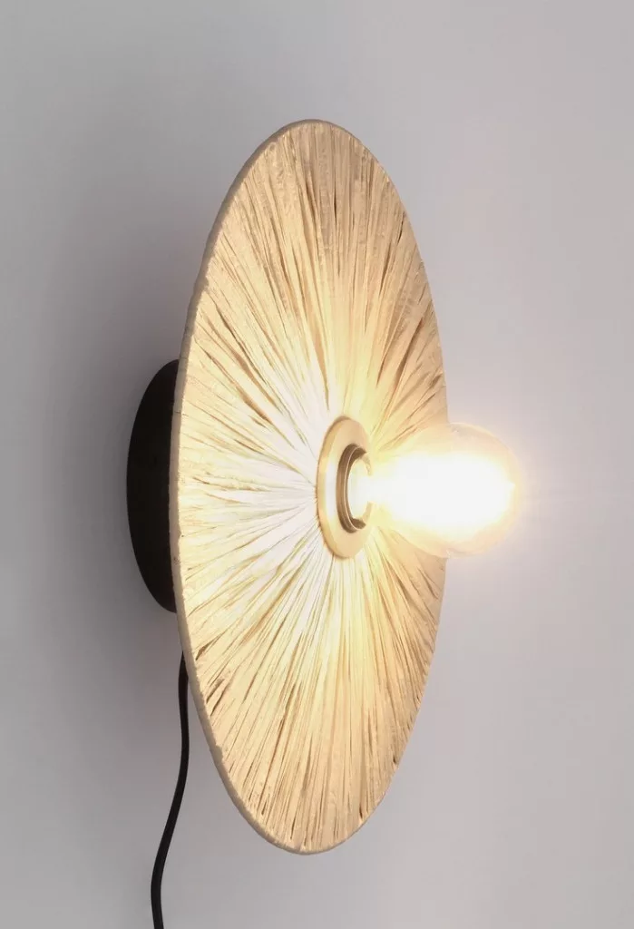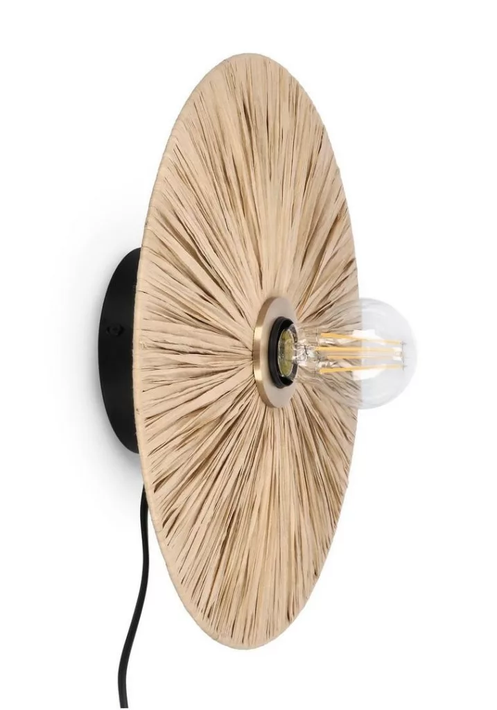Természetes rafiából készült, kör alakú fali lámpa, amely tökéletes egyensúlyt teremt a bohém stílus és a modern design között. A 33 cm átmérőjű bézs burkolat kellemes, szórt fényt biztosít.