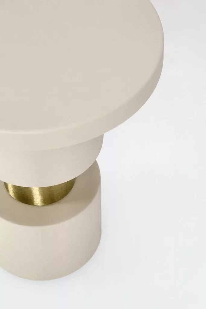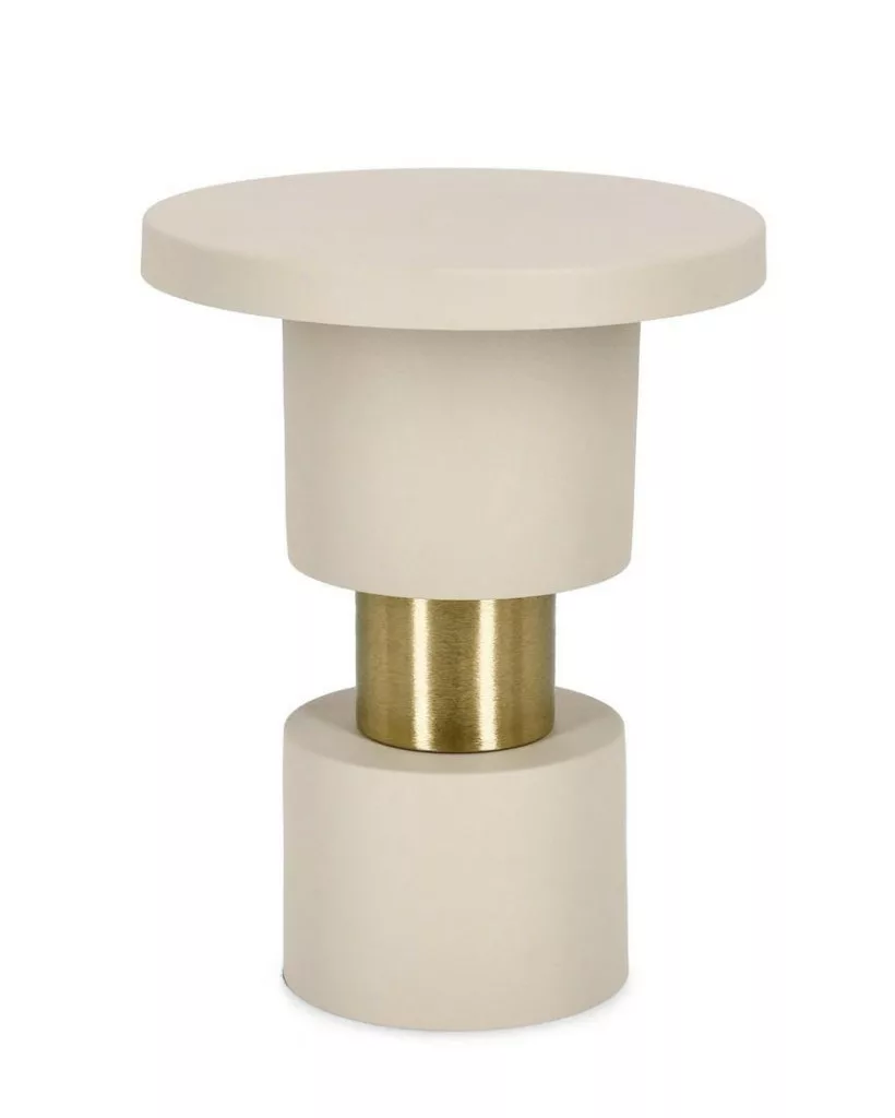A Bizzotto Mitul Fog dohányzóasztal a modern elegancia megtestesítője. A hengeres forma és a matt bézs felület tökéletes harmóniában áll az arany fémelemekkel, amely különleges karaktert kölcsönöz a bútornak. A minimalista dizájn ellenére a részletek gondos kidolgozása szembeötlő.