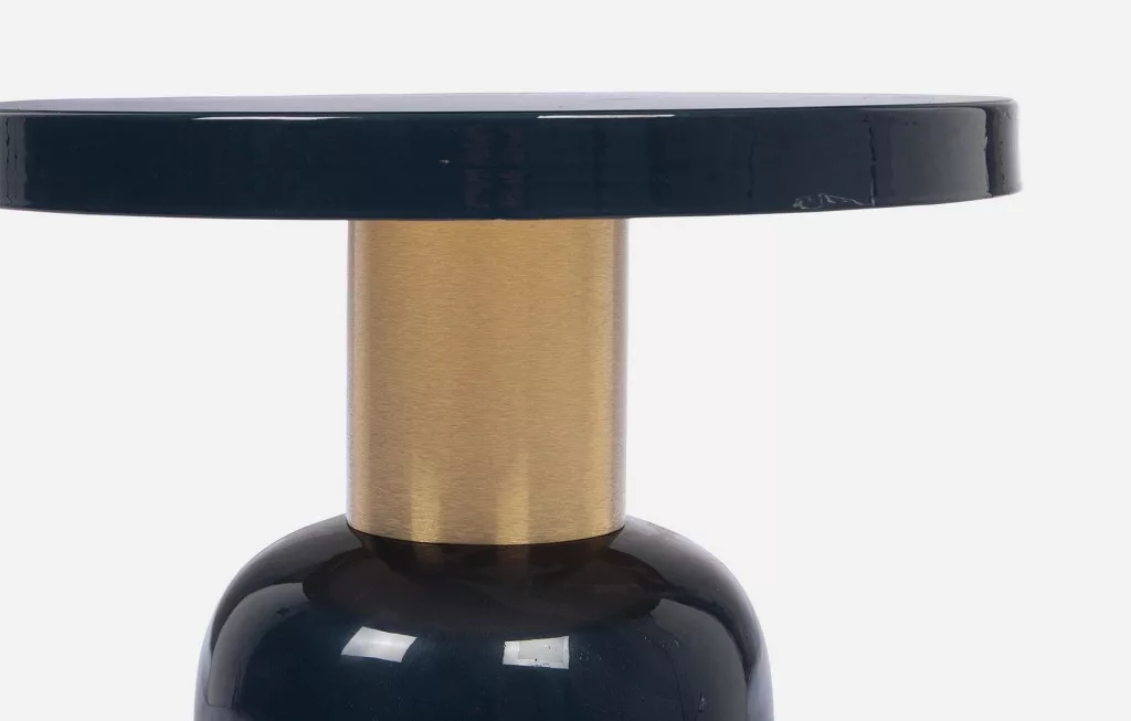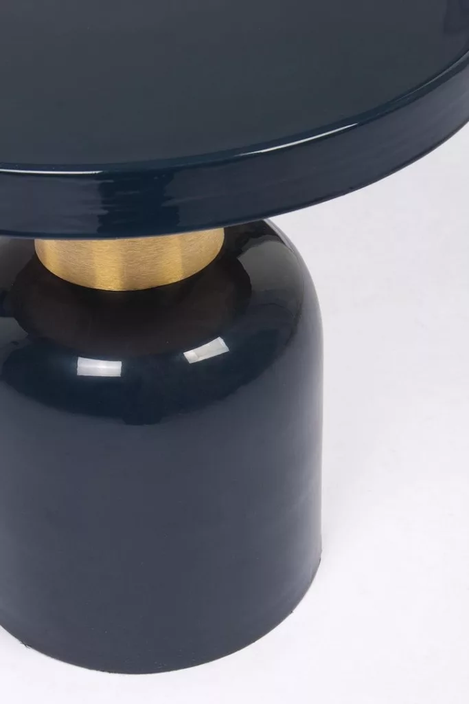 Elegáns, modern dohányzóasztal sötétkék zománcozott acél kivitelben, arany színű dekoratív elemmel, amely tökéletes választás a kifinomult lakberendezéshez.