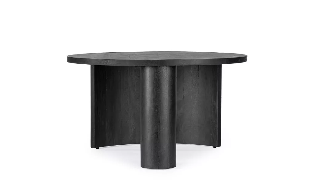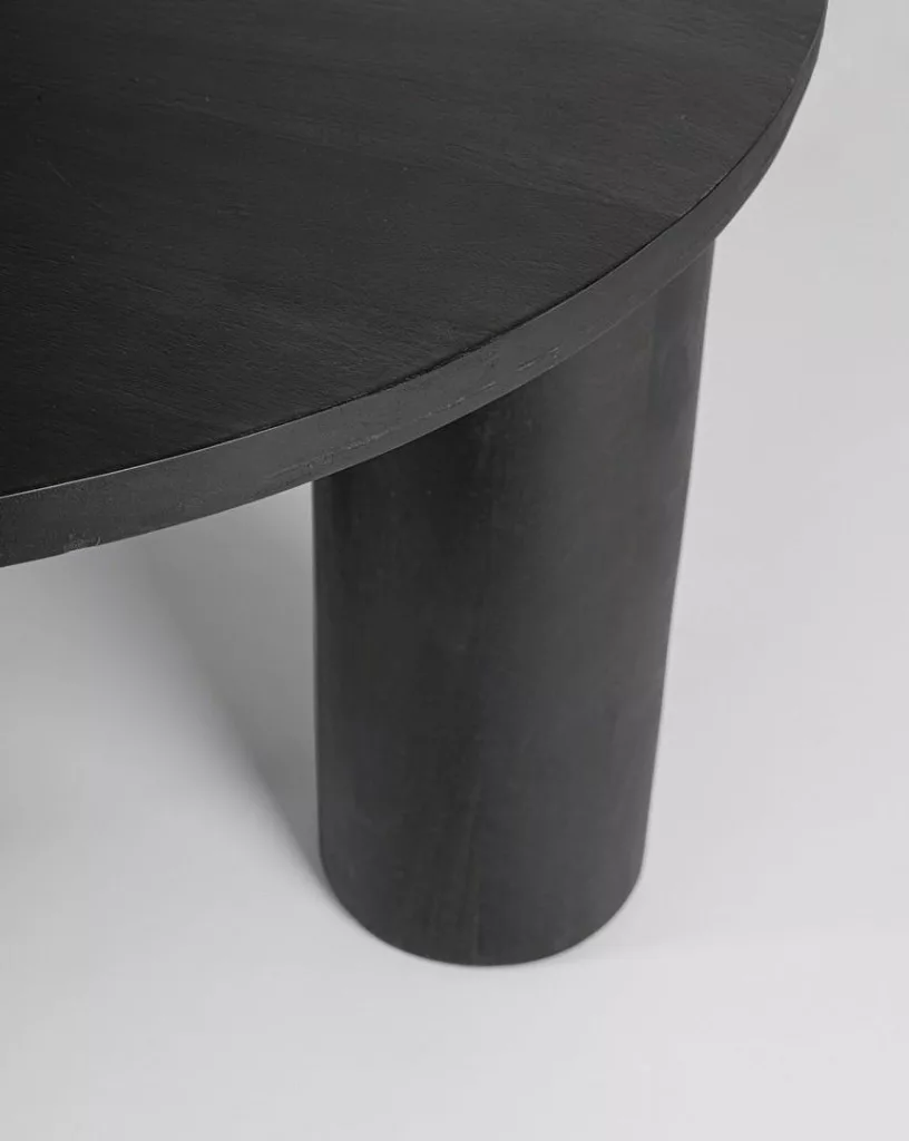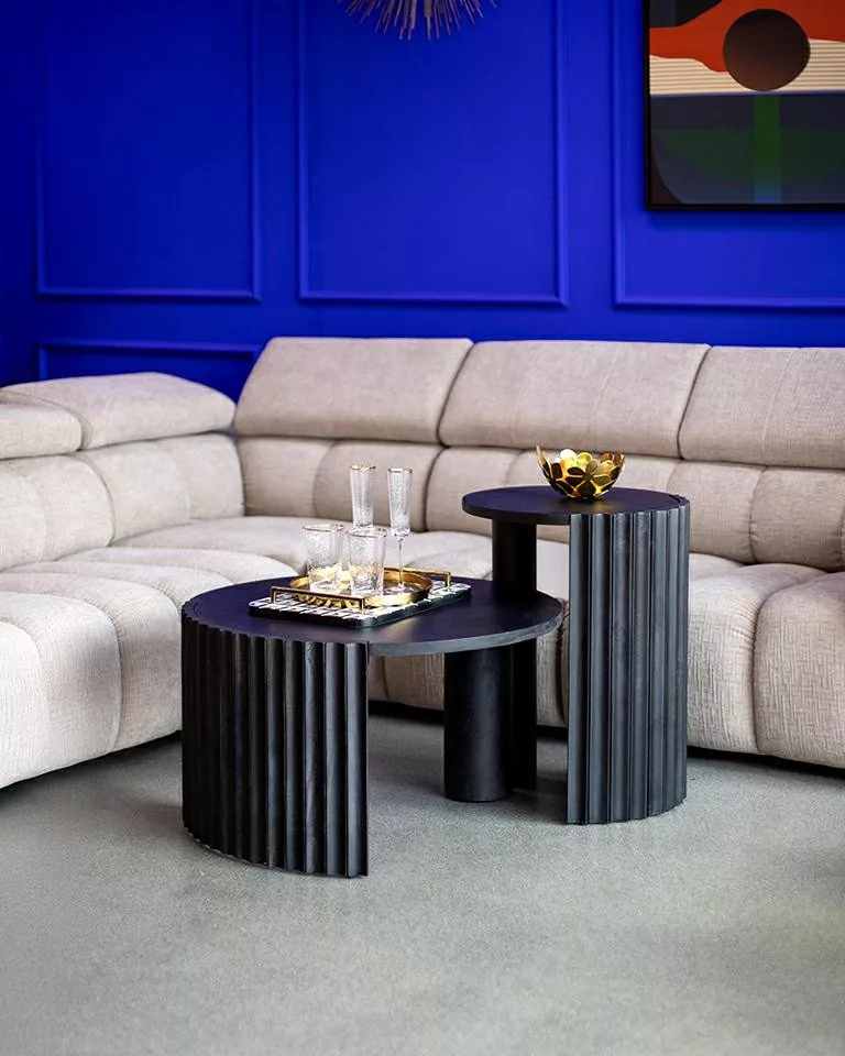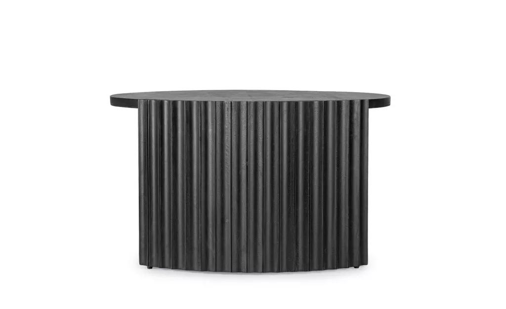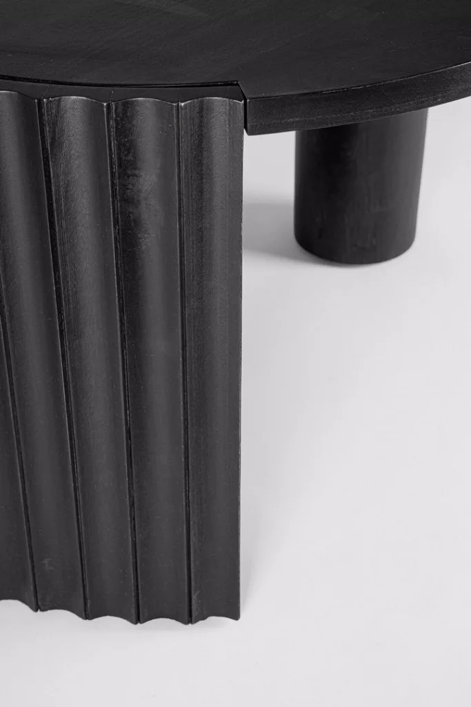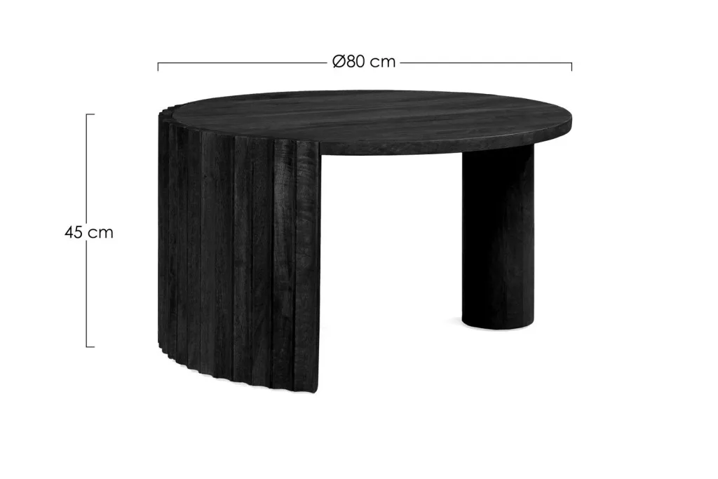 Az Orissa dohányzóasztal a modern design és a természetes anyagok találkozásának mesteri példája. A mangófából készült asztal különlegességét a bordázott oldallap adja, amely dinamikus megjelenést kölcsönöz a bútornak. A fekete felületkezelés kiemeli a fa természetes erezetét, míg az asztal kör alakú lapja lágy kontrasztot képez az egyenes vonalakkal.