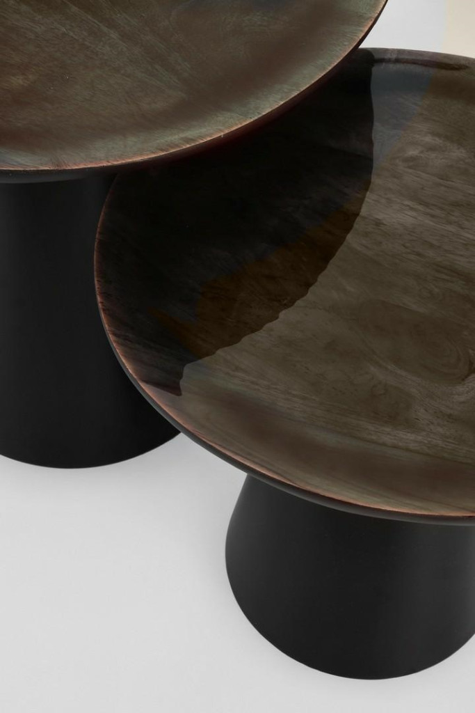 Elegáns, kétrészes dohányzóasztal szett mangófából készült lakkozott lapokkal és modern, kúpos fekete acél lábszerkezettel.