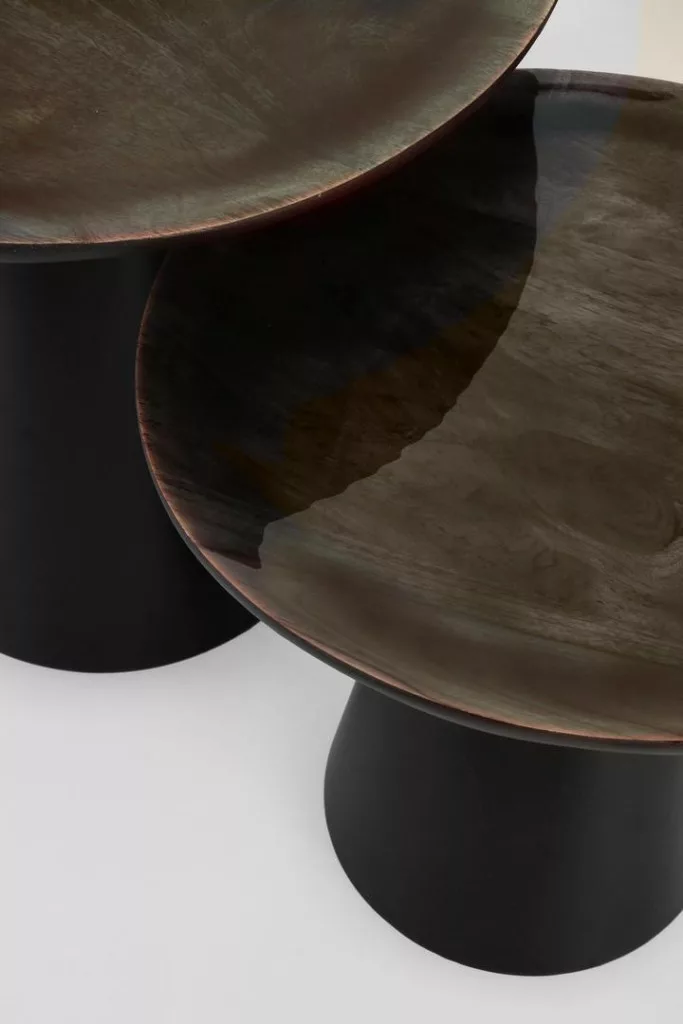 A BIZZOTTO ZAINAB dohányzóasztal szett a modern lakberendezés remekműve. A tömör mangófából készült, lakkozott asztallap természetes szépsége harmonikusan találkozik a matt fekete acél lábszerkezet ipari eleganciájával. A különleges felületkezelésnek köszönhetően minden darab egyedi mintázattal rendelkezik.