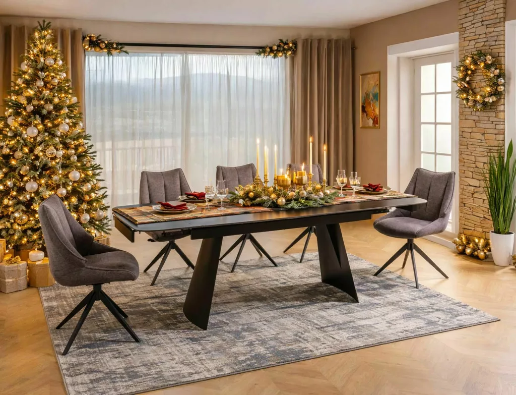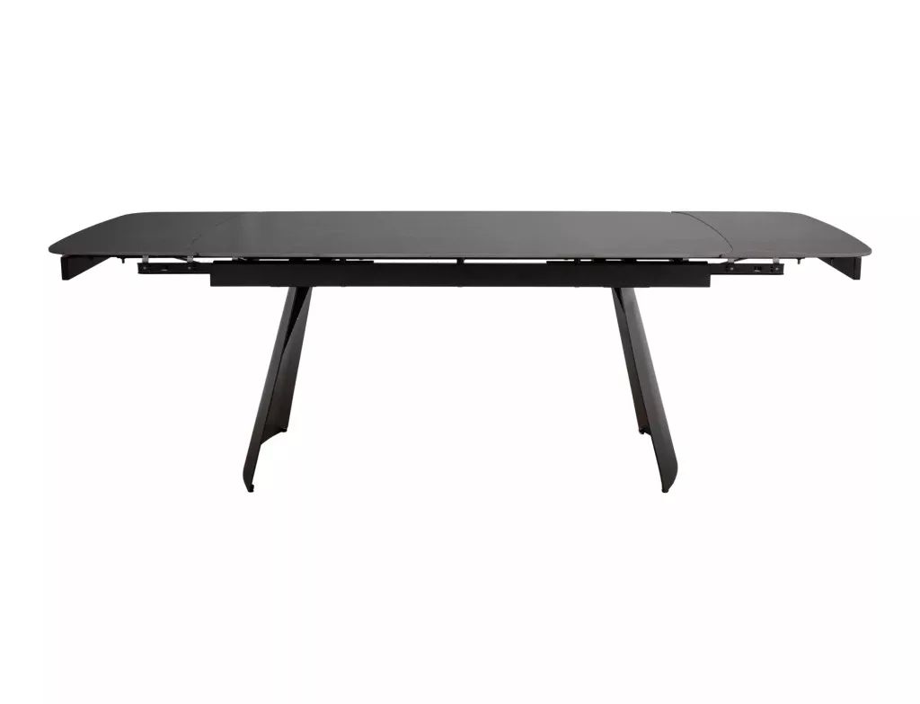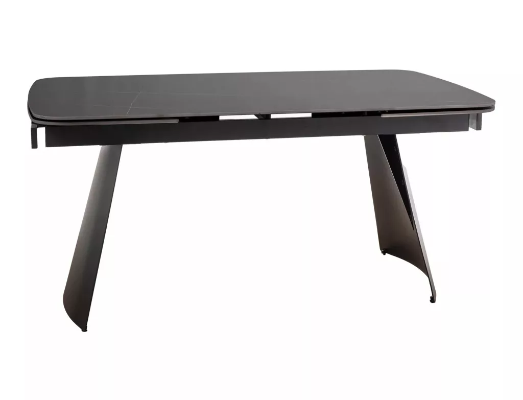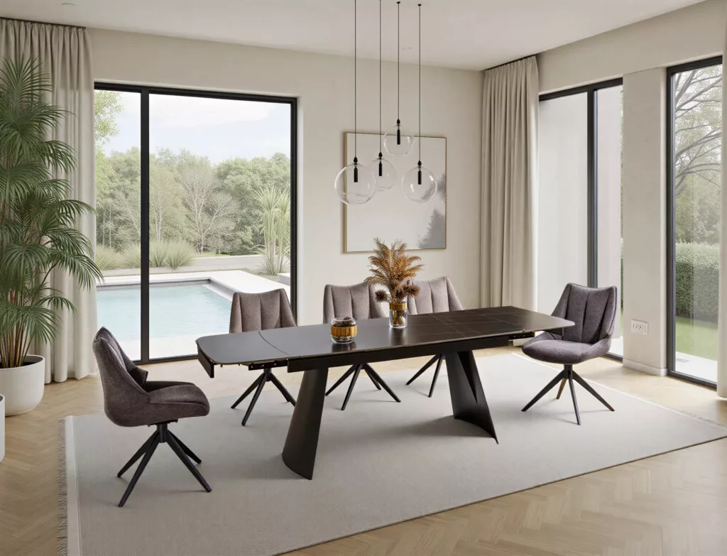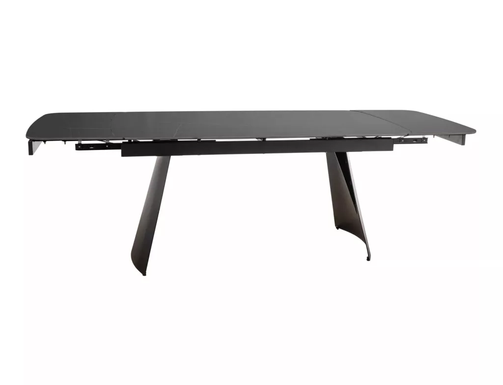 Modern, kihúzható étkezőasztal kerámia asztallappal és matt fekete fém vázzal, amely tökéletes választás a kortárs étkező terekbe.