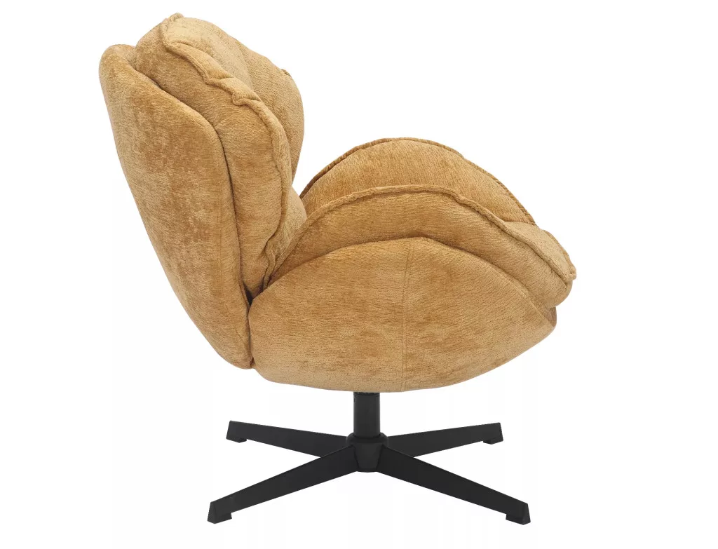 Modern vonalvezetésű, 360 fokban forgatható fotel curry színű szövet kárpitozással és fekete fém vázzal, amely tökéletes választás mind otthoni, mind közösségi terekbe.