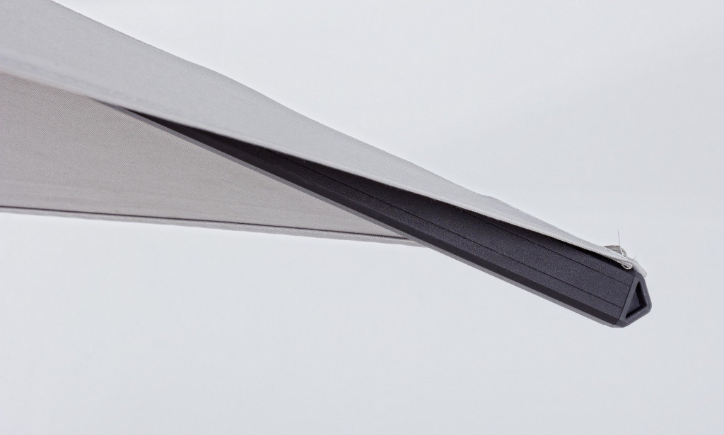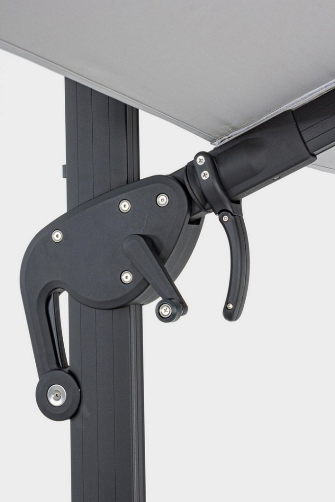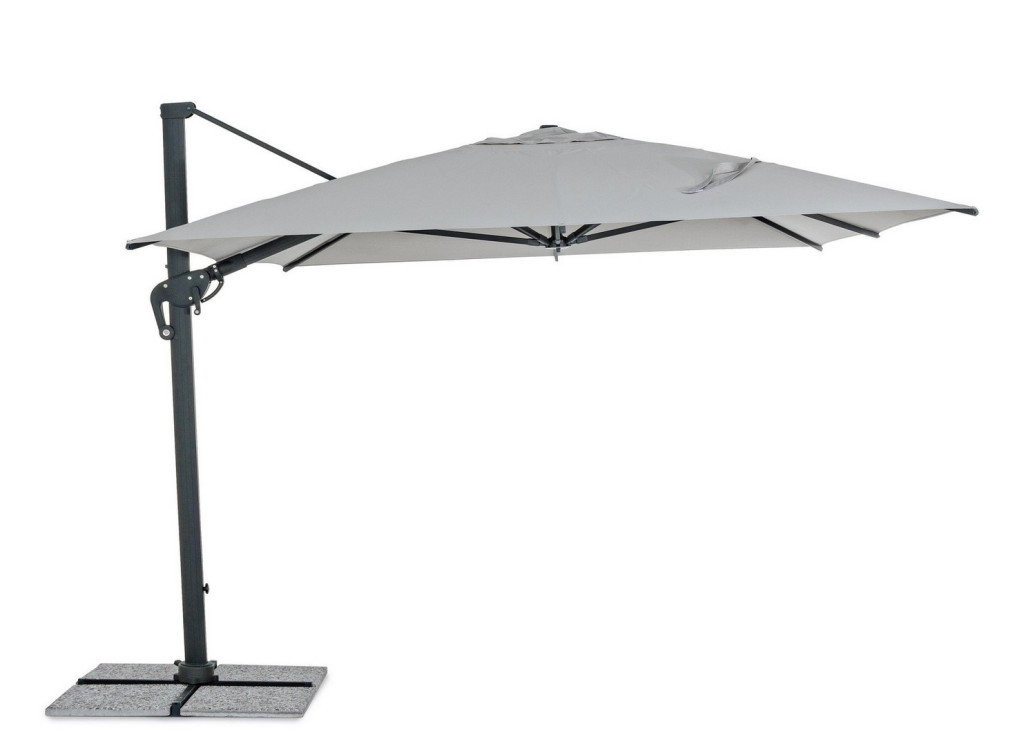 Prémium minőségű, 360°-ban forgatható oldalkaros napernyő UV-álló poliészter anyagból, négy pozícióban állítható dőlésszöggel és beépített szellőzőnyílással.