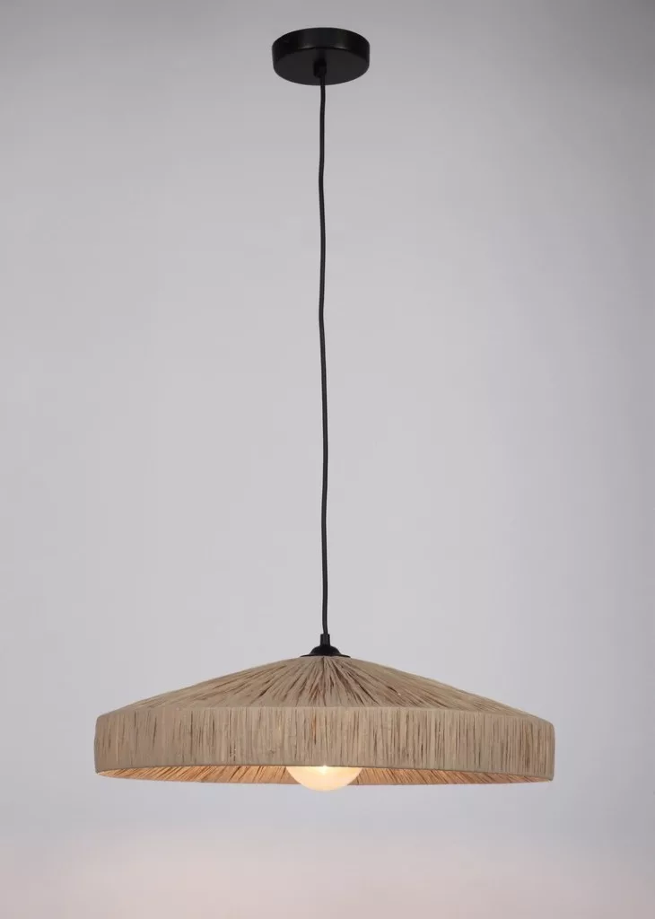 Természetes rafiából készült, modern boho stílusú függőlámpa, amely lágy, szórt fényével és organikus megjelenésével egyedi hangulatot teremt otthonában.