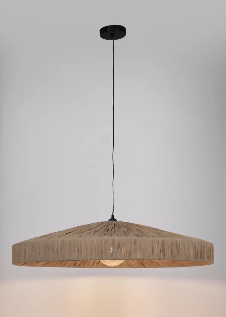 A Kanda függőlámpa a természetes anyagok és a modern formatervezés tökéletes ötvözete. A rafiából készült, 80 cm átmérőjű impozáns lámpaernyő organikus textúrájával és meleg bézs árnyalatával azonnal a tér központi elemévé válik. A természetes anyag különleges fényjátékot hoz létre, lágy, szórt megvilágítást biztosítva.