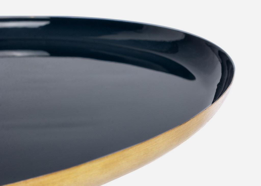 Elegáns kék-arany színkombinációjú dohányzóasztal zománcozott acél kivitelben, amely tökéletesen ötvözi a modern dizájnt a klasszikus eleganciával.