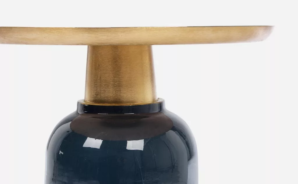 A Bizzotto Nalima dohányzóasztal a modern lakberendezés kiemelkedő darabja. A kék zománcozott acél felület és az arany színű díszítőelemek harmonikus összhangja azonnal magára vonzza a tekintetet. A kecses, palack formájú láb és a könnyed, kerek asztallap tökéletes egyensúlyt teremt.