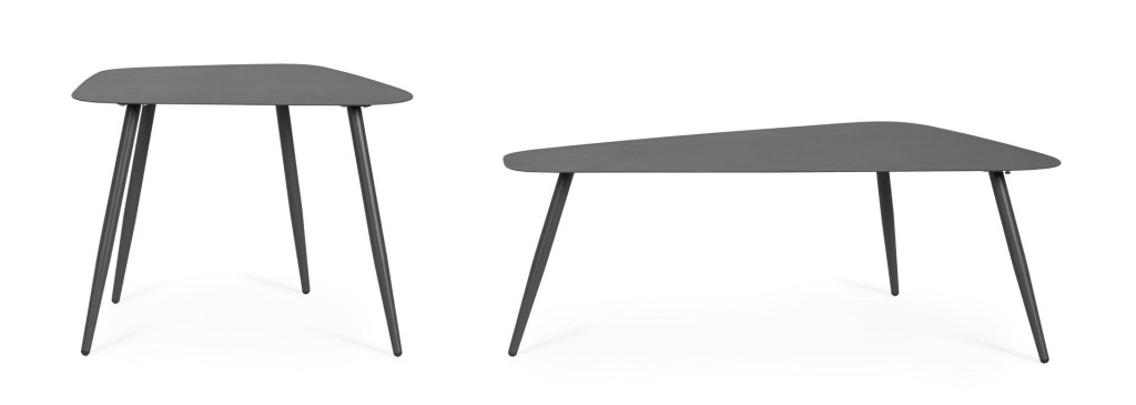 A Bizzotto Yvonne Flared asztalszett tökéletes választás azoknak, akik modern és időtálló kültéri bútort keresnek. A két különböző méretű asztal egyedi formájával és antracit színével azonnal magára vonzza a tekintetet. A minőségi acélszerkezet és a speciális porszórt bevonat garantálja a tartósságot.