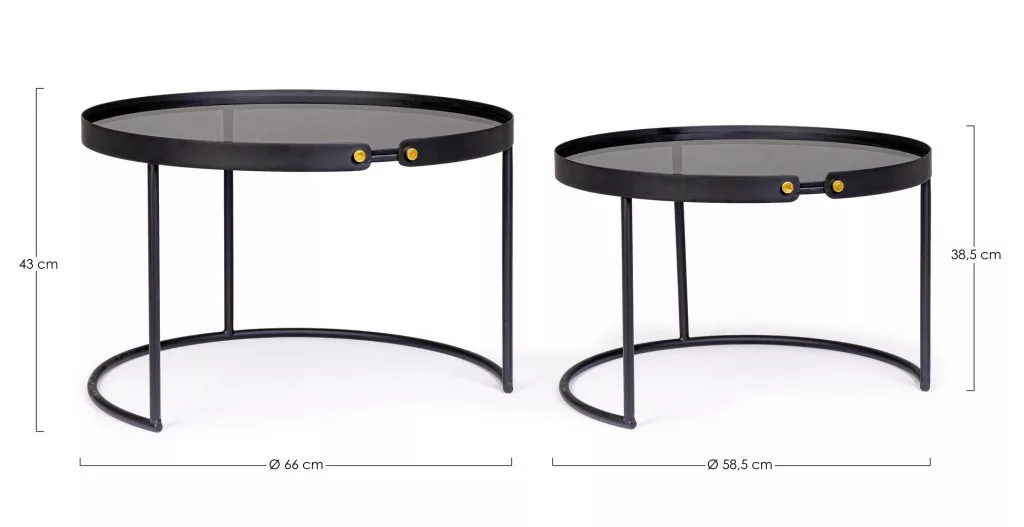 A Bizzotto ZEINA ROUND dohányzóasztal szett tökéletes példája a modern design és funkcionalitás találkozásának. A porszórt acél váz és az edzett üveg lapok kombinációja időtálló eleganciát kölcsönöz, míg az arany színű csatlakozóelemek különleges részletként emelkednek ki a fekete felületből.