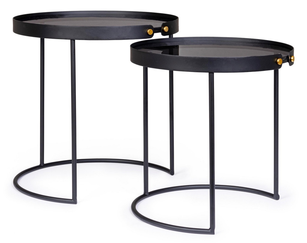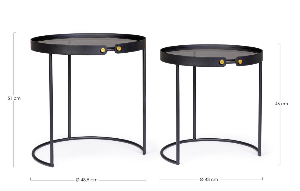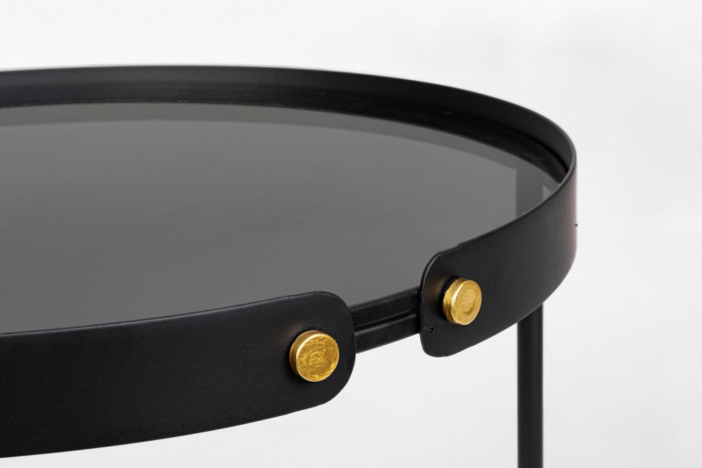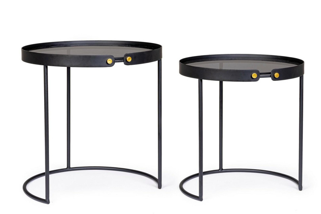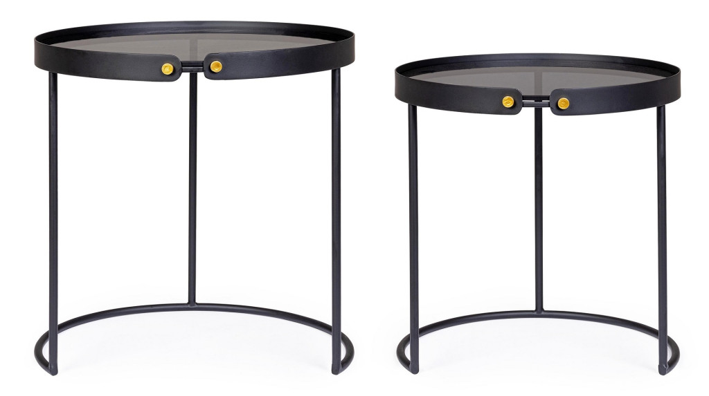 Az arany színű csatlakozóelemek kifinomult részletként jelennek meg a fekete vázon. A két asztal egymás alá tolható kialakítása praktikus helykihasználást tesz lehetővé, így ideális választás kisebb terekbe is.