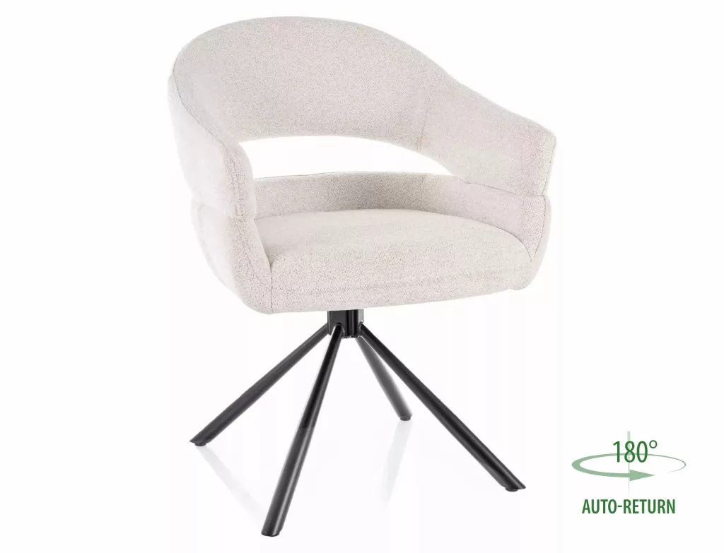 Modern, forgó étkezőszék auto-return funkcióval, kényelmes bézs szövet kárpitozással és matt fekete fém vázzal.