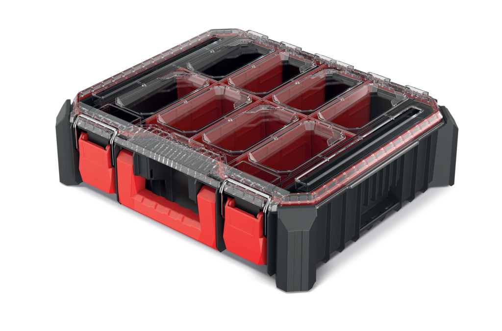 Innovatív, kettős funkciójú szerszámrendező adapter átlátszó fedéllel és 11 kivehető tárolórekesszel, amely tökéletes megoldást nyújt a kisebb alkatrészek rendszerezésére és a szerszámosládák összekapcsolására.