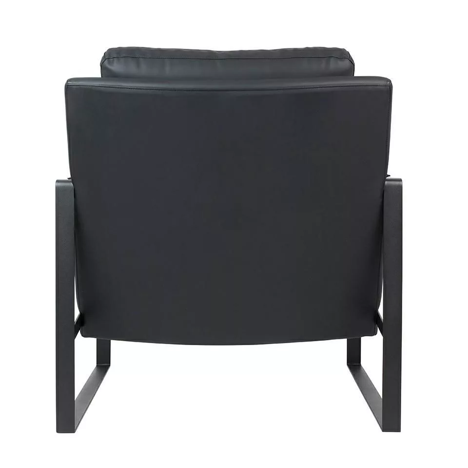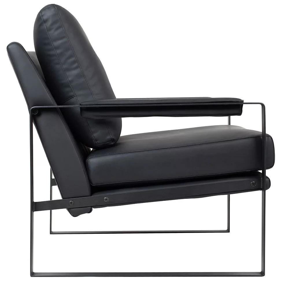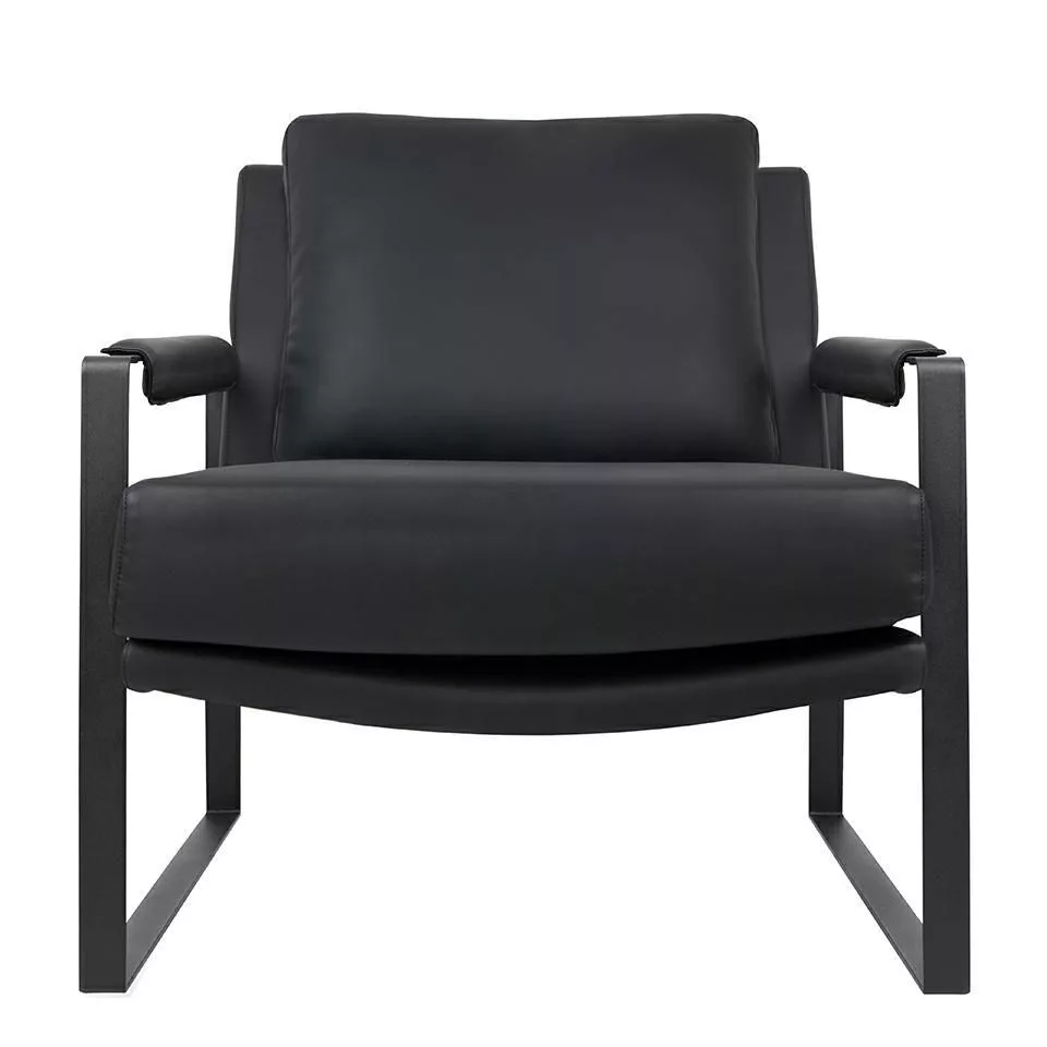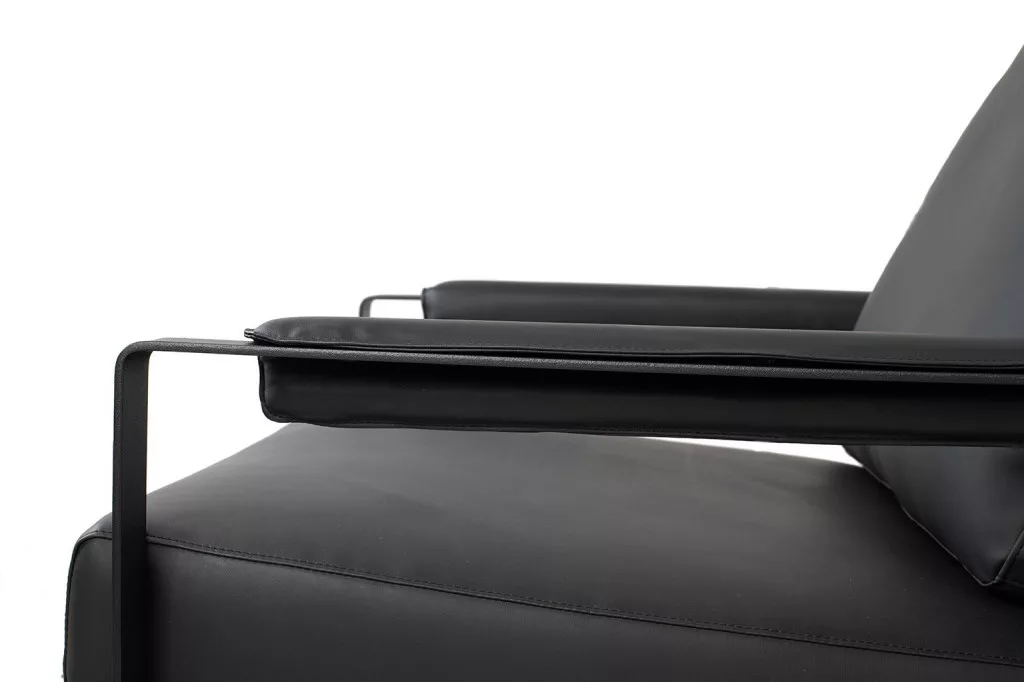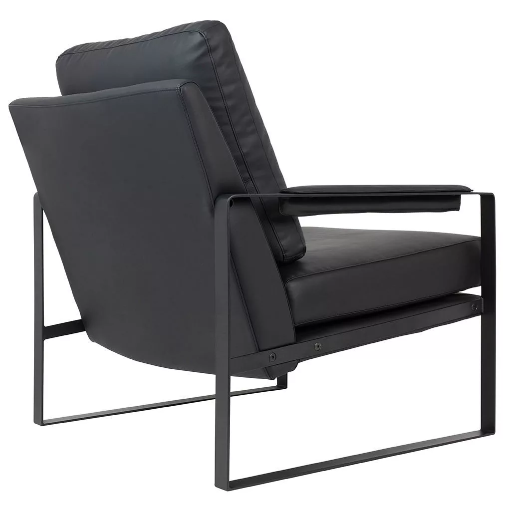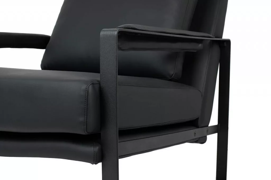 Klasszikus karosszék univerzális színű, ökobőrrel kárpitozott karfával, fekete festett fémből készült talppal.