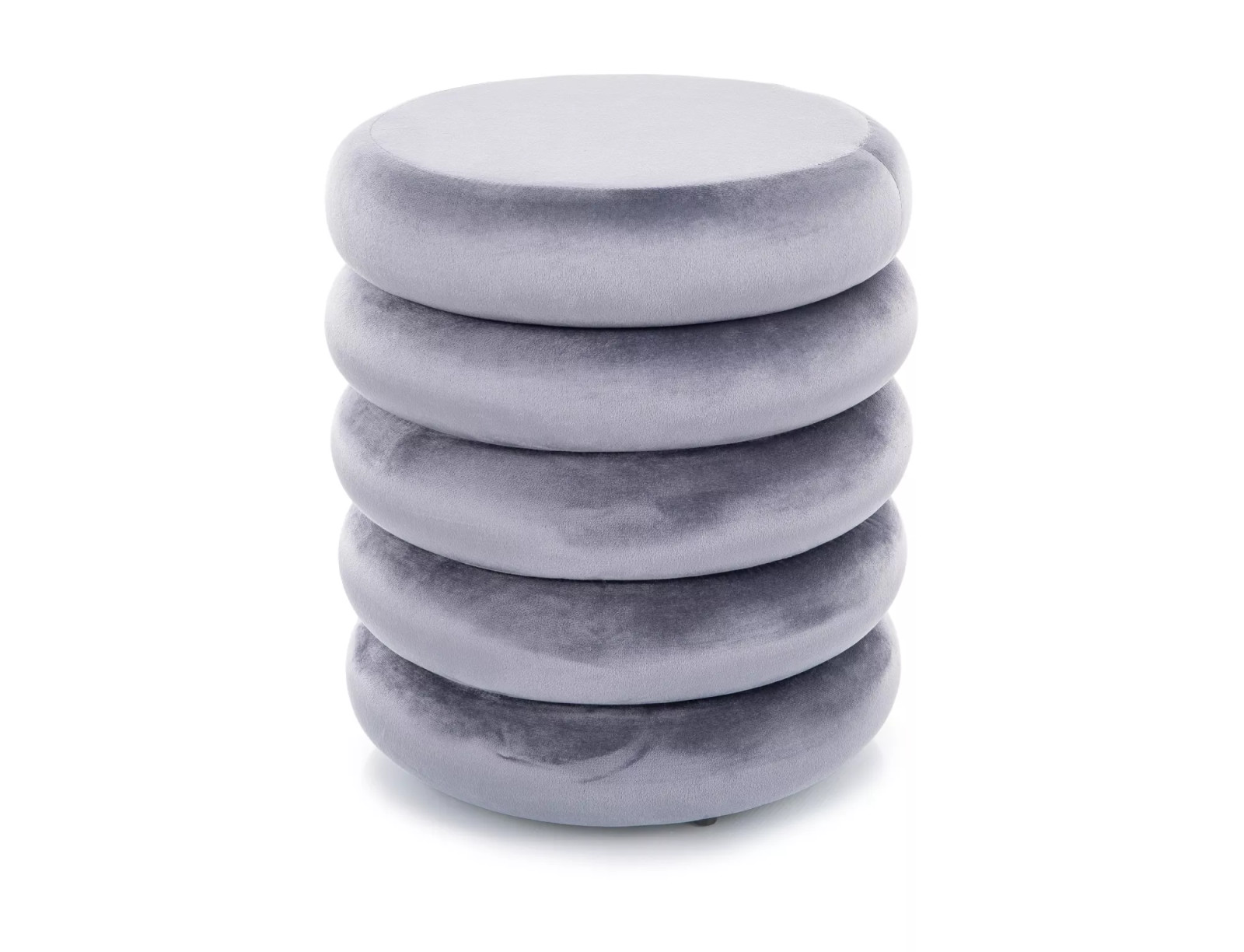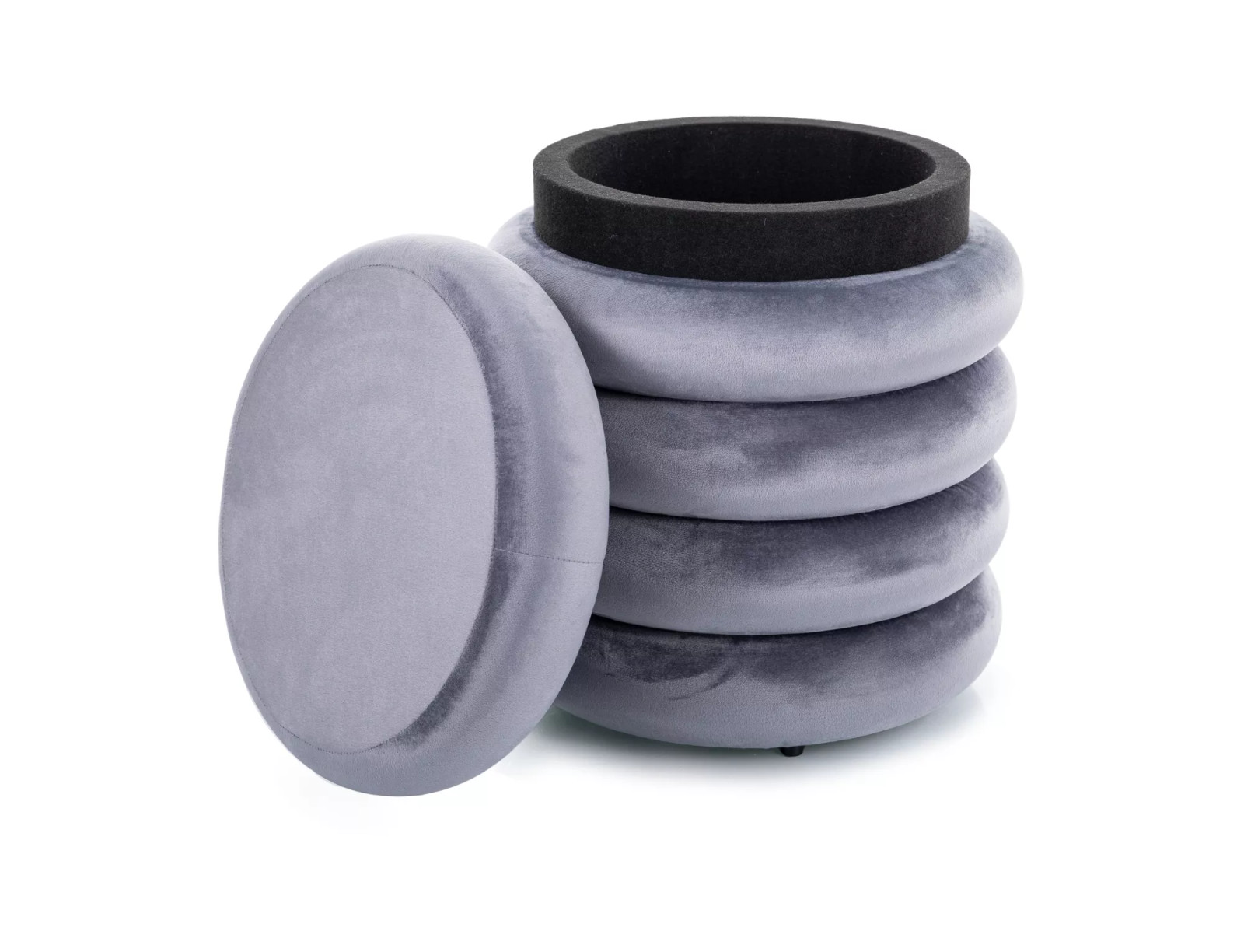 Elegáns, többrétegű kialakítású tárolós puff szürke bársony kárpitozással, amely tökéletes kiegészítője modern otthonának.