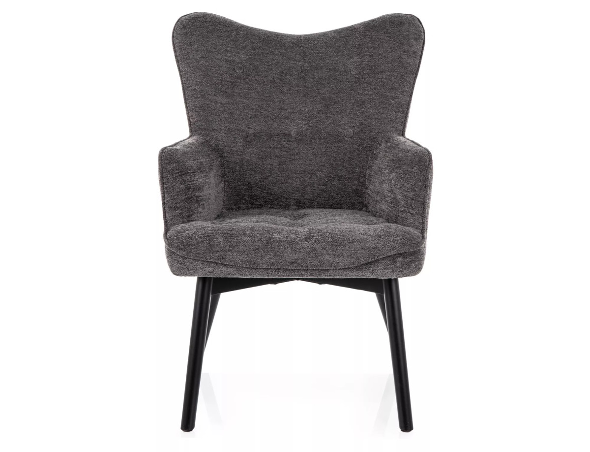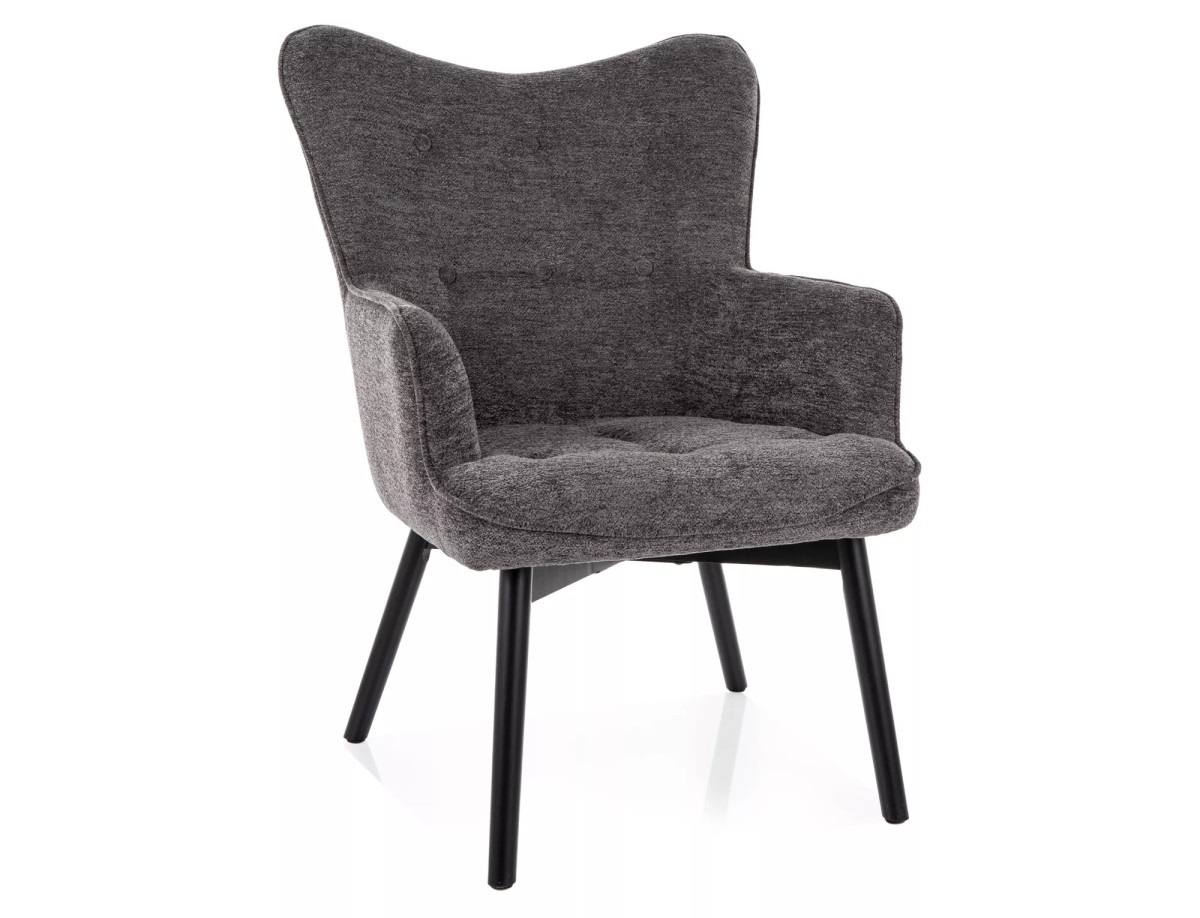 Elegáns, modern vonalvezetésű fotel szürke Raven szövettel és matt fekete fa lábakkal, amely tökéletes választás mind otthoni, mind közületi terekbe.