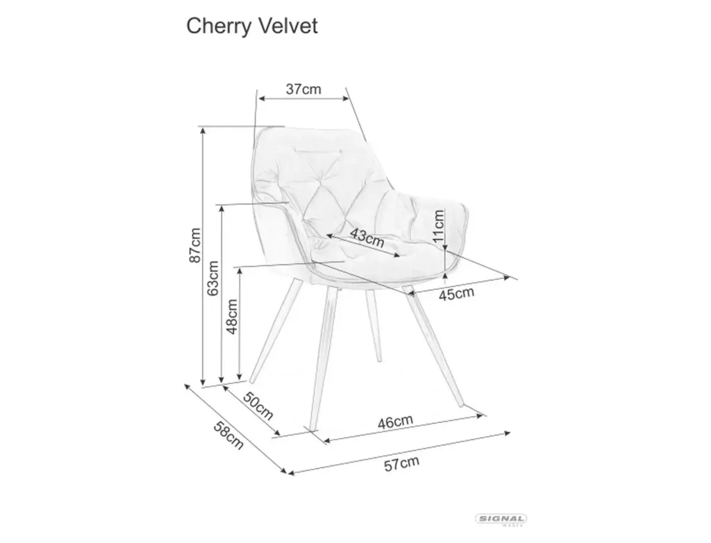 A Cherry Velvet étkezőszék a modern elegancia és a kivételes kényelem tökéletes ötvözete. A rombusz mintázatú, steppelt háttámla és ülőfelület prémium megjelenést kölcsönöz, míg a puha bársony kárpitozás kellemes tapintást biztosít. A karfás kialakítás extra kényelmet nyújt hosszabb étkezések vagy munkavégzés során.
