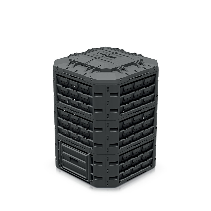 Könnyen összeállítható, 950 literes moduláris komposztáló tartály UV-álló műanyagból, biztonsági fedéllel és alsó ürítőnyílással.
