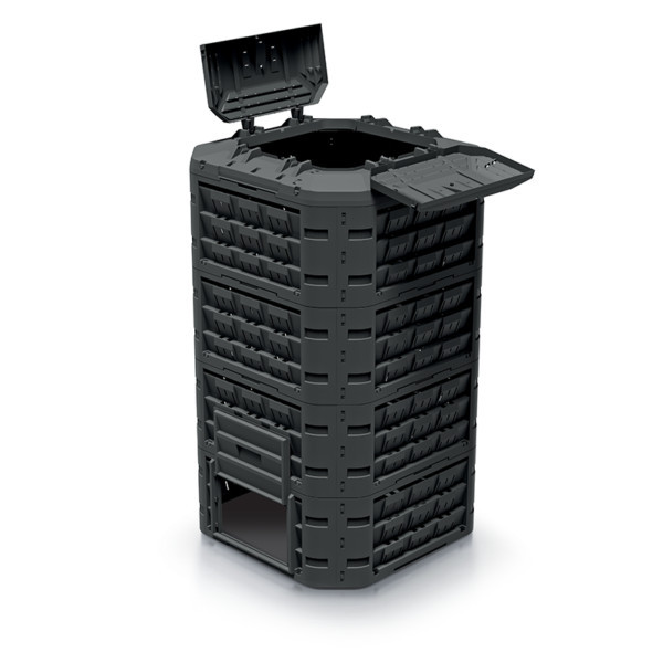 A Compogreen Vario komposztáló egy innovatív, szerszámok nélkül összeállítható moduláris rendszer. A felső egység nagy beöntőnyílással és biztonsági zárral ellátott fedéllel rendelkezik, míg az alsó modul két praktikus ürítőajtóval van felszerelve a kész komposzt könnyű kiemelése érdekében.