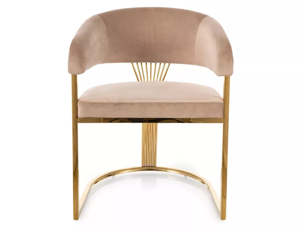 A Crown Velvet étkezőszék a modern luxus megtestesítője, amely ötvözi a kiemelkedő kényelmet és a szemet gyönyörködtető designt. A bézs színű, puha bársony kárpitozás és az arany színű rozsdamentes acél váz harmonikus összhangot teremt, míg a szék íves vonalvezetése különleges eleganciát kölcsönöz.