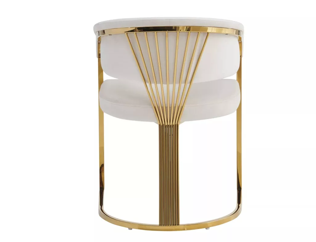 A Crown Velvet étkezőszék a modern luxus megtestesítője, amely ötvözi a kifinomult dizájnt a funkcionalitással. A világos bézs bársony kárpitozás és az arany színű rozsdamentes acél váz harmonikus összhangot teremt, míg az ívelt háttámla tökéletes támaszt nyújt.