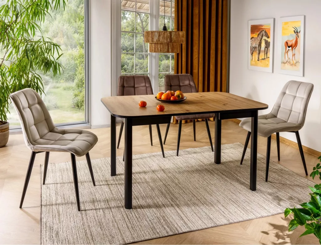 Modern, kinyitható étkezőasztal artisan tölgy asztallappal és matt fekete vázzal, amely tökéletes választás 6 személyes étkezésekhez.