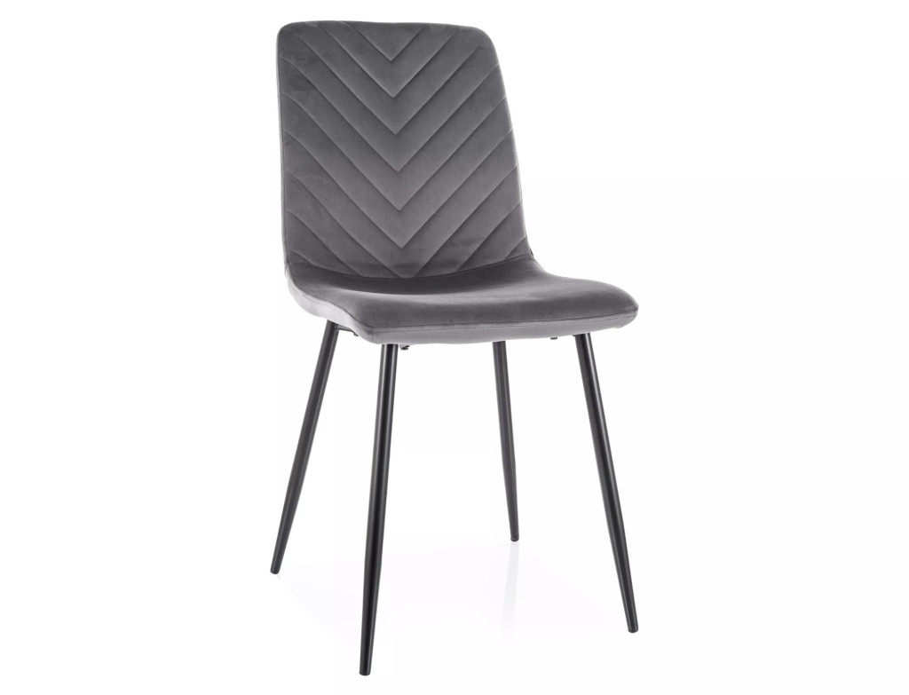 Elegáns, modern étkezőszék szürke bársony kárpitozással és chevron steppelt mintázattal, fekete matt fém lábakkal.