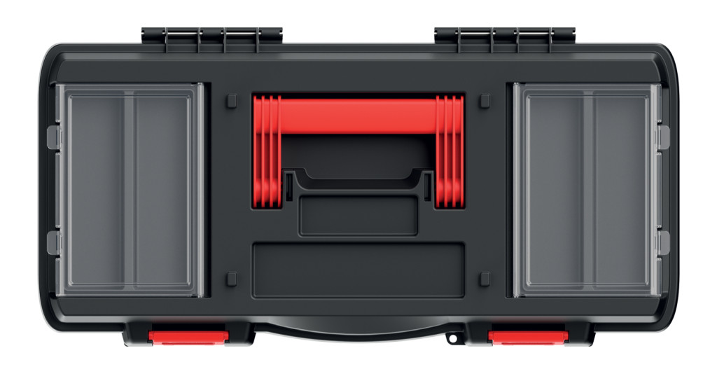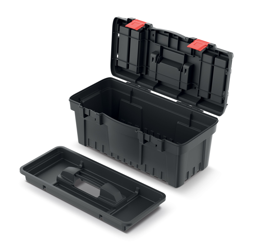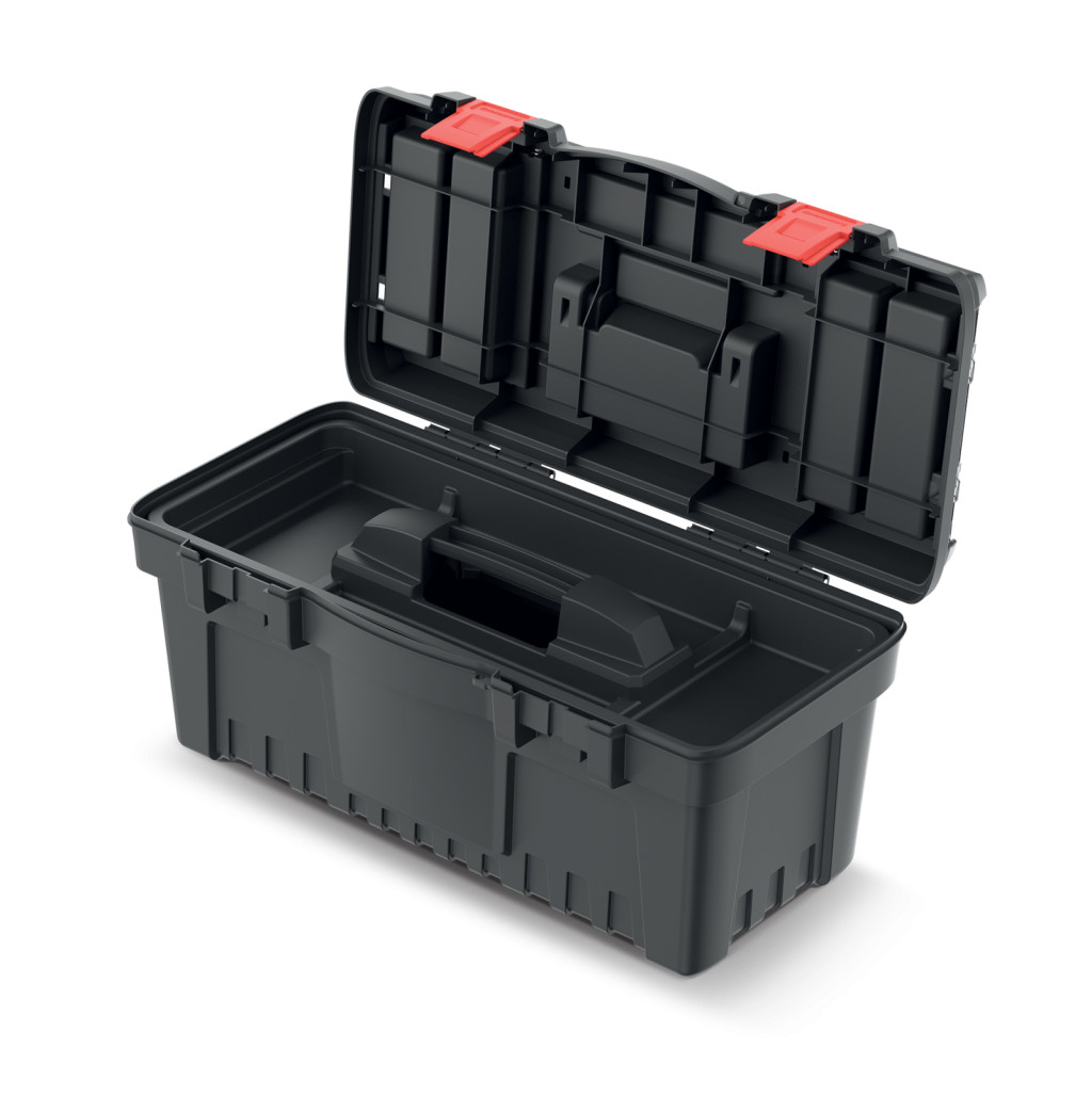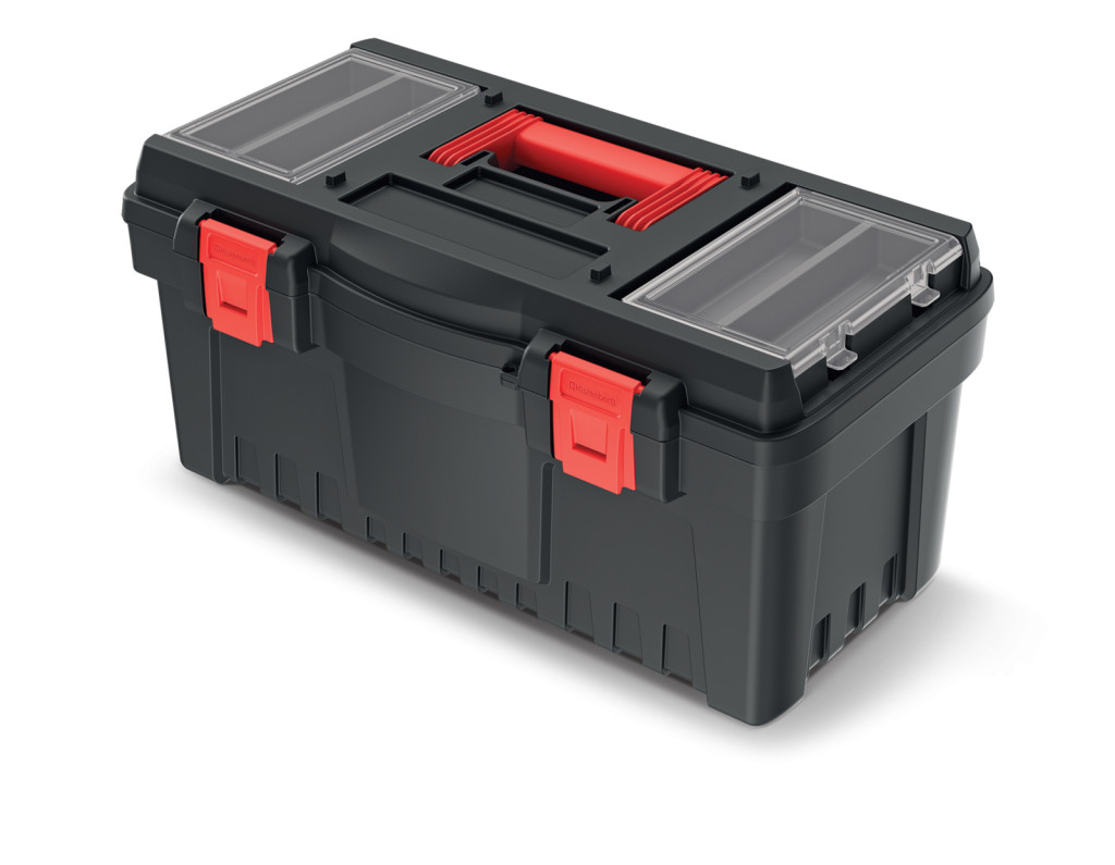 Strapabíró, nagy teherbírású szerszámosláda beépített rendszerezőkkel és 19 kg-os teherbírással, ideális szakemberek és barkácsolók számára.