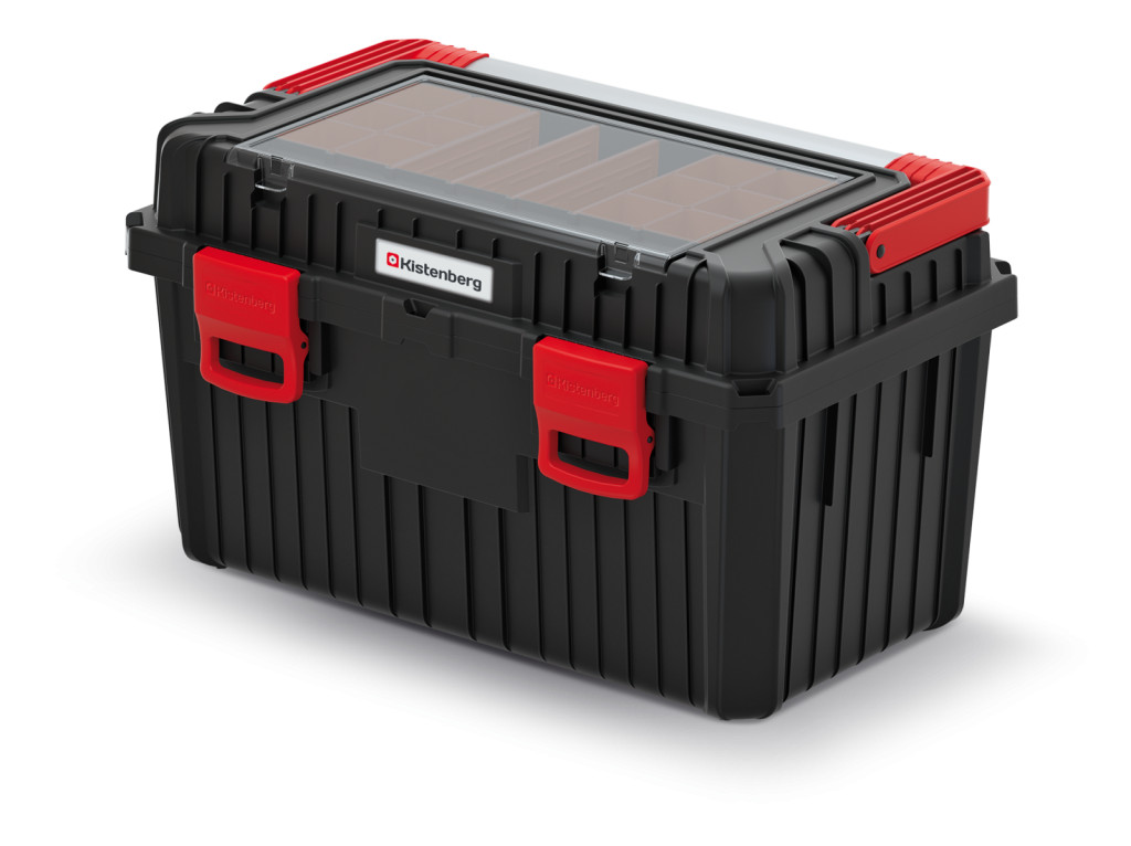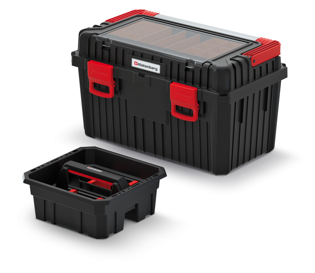 Masszív, nagy teherbírású szerszámosláda beépített rendszerezővel és 25 kg teherbírással, ideális professzionális használatra.