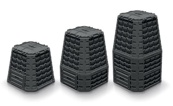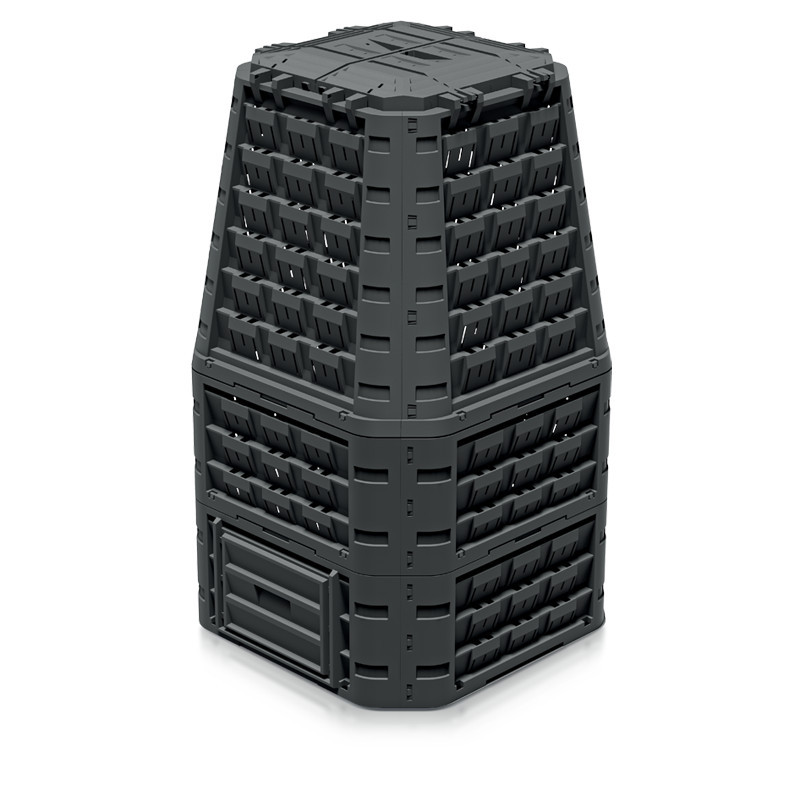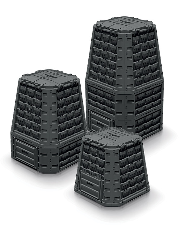 Könnyen összeállítható, nagy kapacitású moduláris komposztáló rendszer UV-álló műanyagból, zárt fedéllel és kényelmes ürítőnyílásokkal.