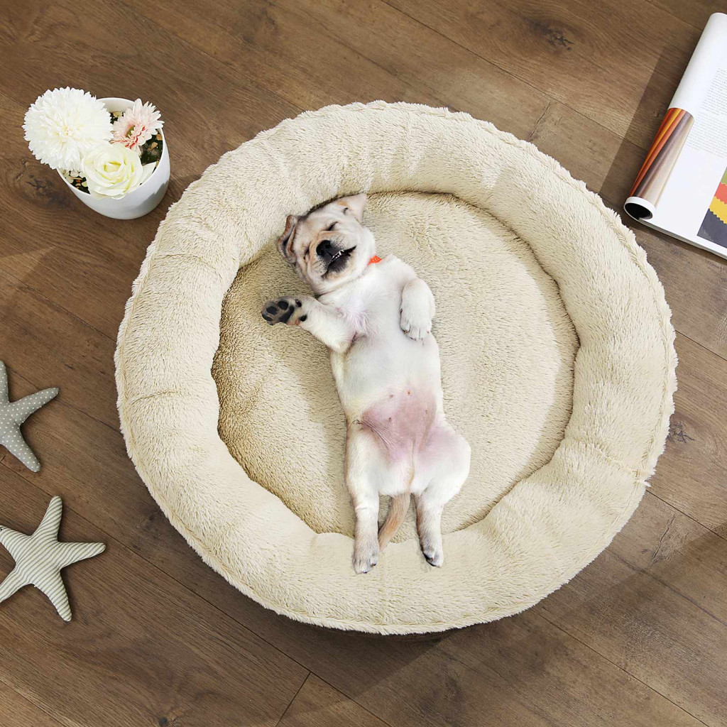 Luxus kialakítású, fánk alakú kutyaágy memóriahabos töltettel és puha plüss felülettel, amely tökéletes pihenőhelyet biztosít kedvencének.