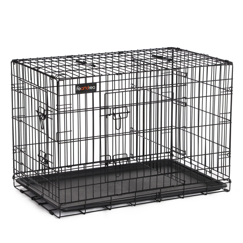 Praktikus, kétajtós kutyaketrec kis- és közepes méretű kutyák számára, kivehető elválasztópanellel és könnyen tisztítható tálcával.