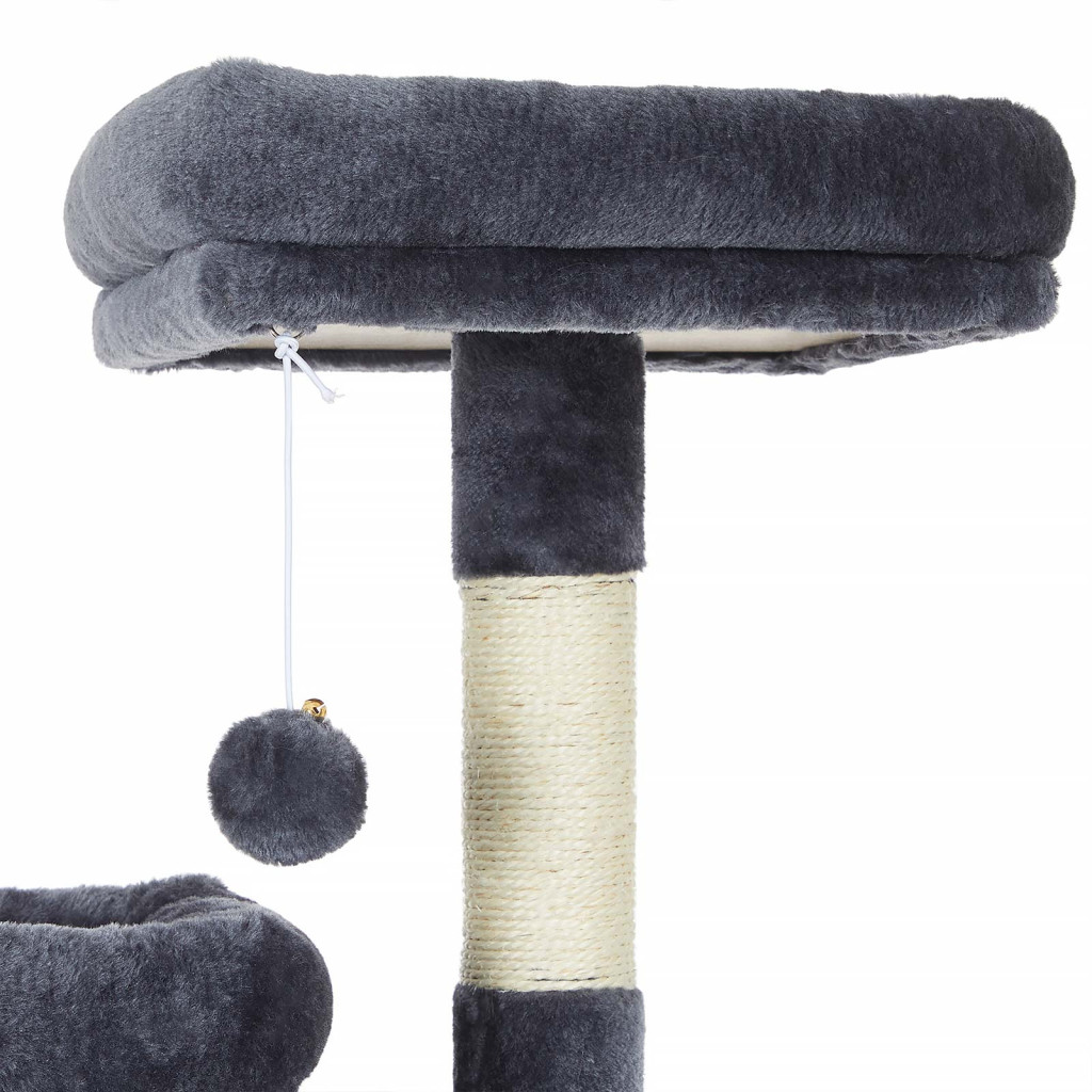 A sisallal bevont oszlopok és a kaparórámpa kiváló lehetőséget biztosítanak a karomerősítésre, míg a puha, megemelt peremű fekhelyek biztonságos pihenőhelyet nyújtanak. A megerősített alapzat és a dőlésgátló rendszer garantálja a stabil használatot.