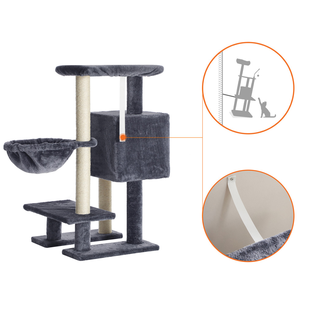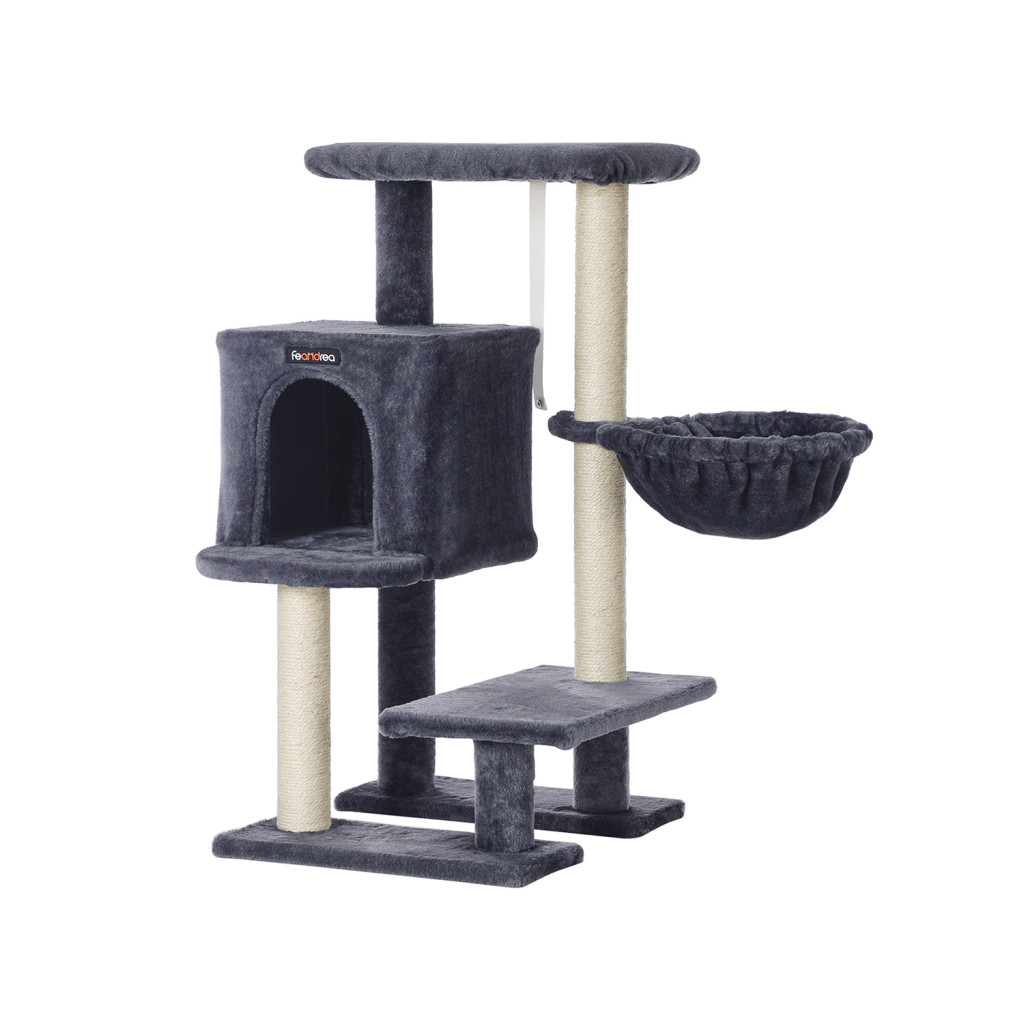 Ez a stílusos, füstszürke macskabútor tökéletes megoldást kínál a korlátozott térrel rendelkező otthonokba. A mindössze 46 x 41 cm alapterületű bútor három különböző magasságban kínál pihenőhelyeket, valamint egy kényelmes barlangot és egy puha függőágyat.