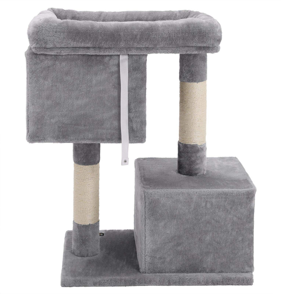 Ez a világosszürke macskabútor tökéletes kombinációja a pihenésnek és az aktív időtöltésnek. A két tágas barlang biztonságos menedéket nyújt, míg a felső platform kiváló kilátóhelyként szolgál. A sisalkötéllel bevont oszlopok lehetőséget biztosítanak a karomélezésre.