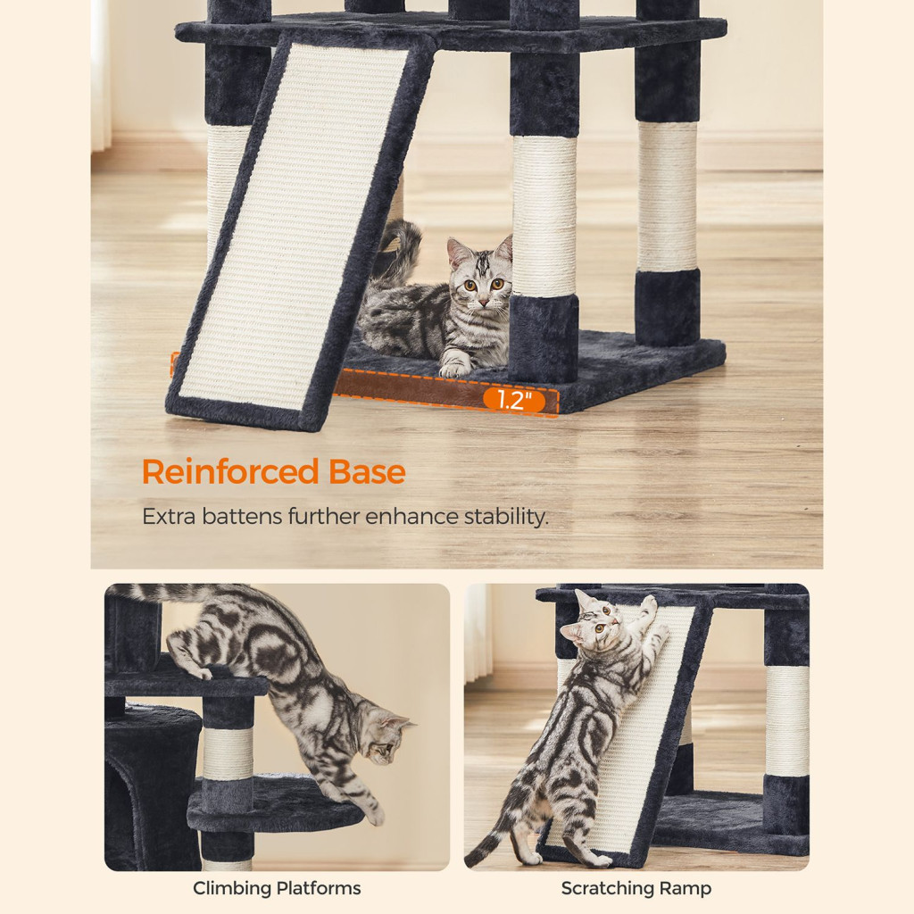 Az alsó szinten található döntött kaparófelület és játszótér extra szórakozást biztosít, míg a puha plüss borítású pihenőhelyek kiemelt peremmel rendelkeznek a maximális kényelem érdekében. A bútor minden elemét úgy tervezték, hogy kedvence biztonságosan mozoghasson szintek között.